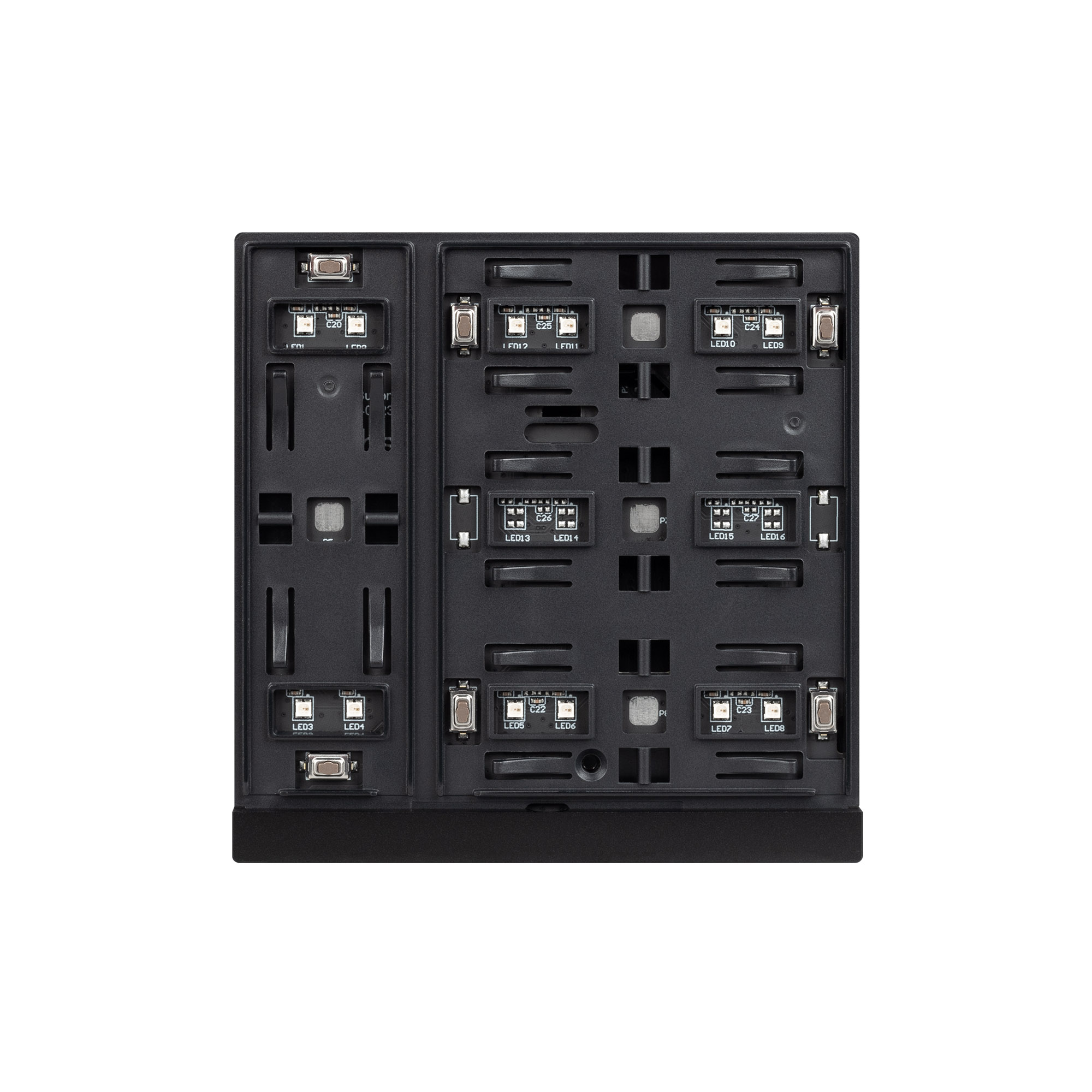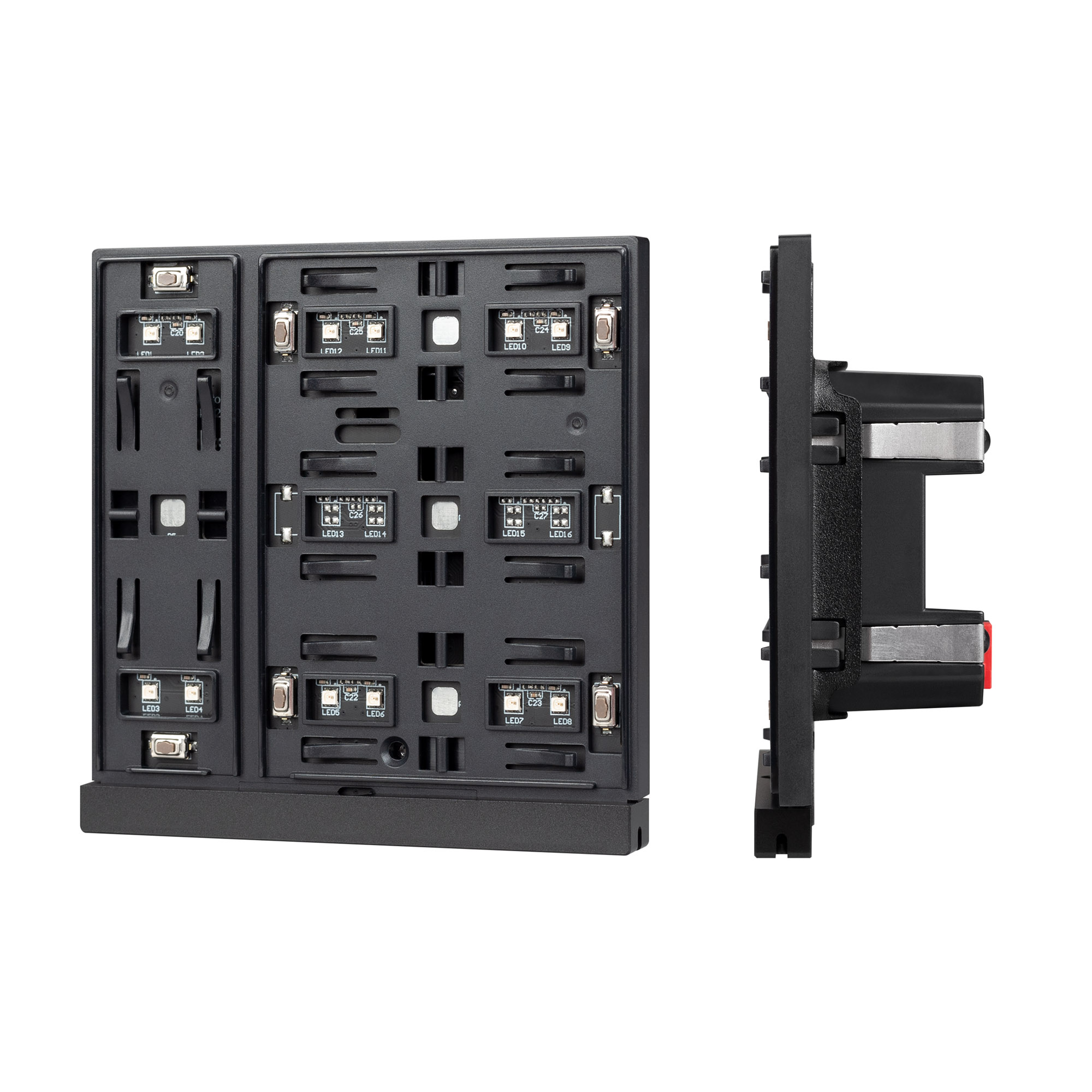 Механизм встраиваемой панели черного цвета с кнопочным управлением, предназначенная для включения и выключения световых сцен в системах управления светом KNX. Позволяет осуществлять включение/выключение, диммирование, управление шторами и жалюзи, управлять сценами. Поддерживает управление с помощью 3 настраиваемых рокерных клавиш. Каждая клавиша может выполнять функции 2-х клавиш. Устройство совместимо с исполнительными устройствами стандарта KNX, в том числе, мировых производителей ABB, SCHNEIDER ELECTRIC, SIEMENS, ZENNIO и другими. Удобное и точное управление при помощи отдельных механических кнопок для каждой функции. Питание от шины KNX. Габариты устройства составляют 86x86x33 мм, установка в стандартную монтажную коробку. Пластиковый корпус, цвет черый, безрамочный корпус, материал - пластик, светодиодная индикация.