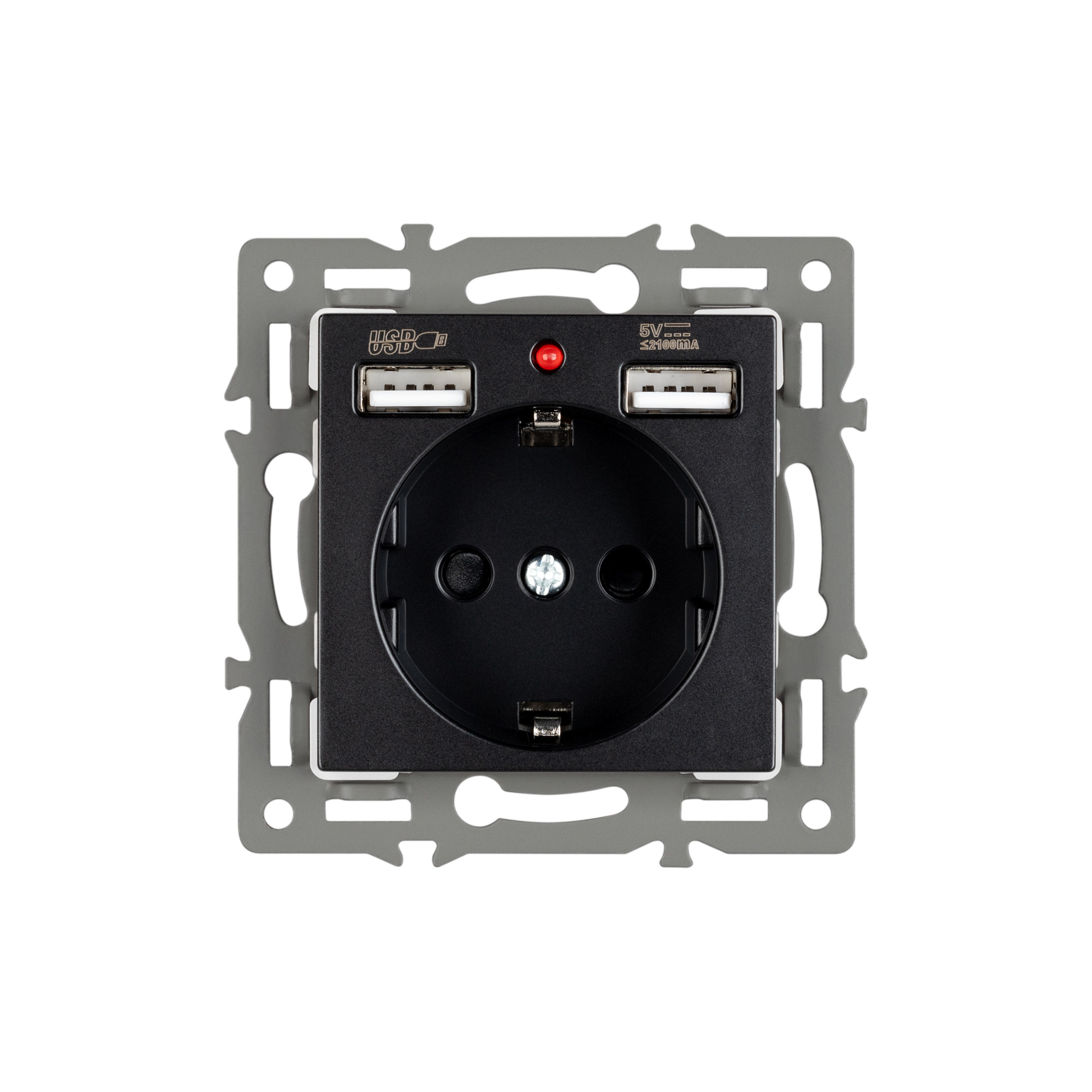 Механизм розетки с заземлением 1 пост 2 USB Type-A, с суппортом из алюминия. Цвет - черный. Степень пылевлагозащиты - IP20. Устанавливается в стандартный круглый подрозетник 220V (Арт.044895). Рабочее напряжение 110-250V. Макс. ток нагрузки 16А. Габаритные размеры: длина 74 мм, ширина 74 мм, высота 44 мм. Гарантийный срок 10 лет.
