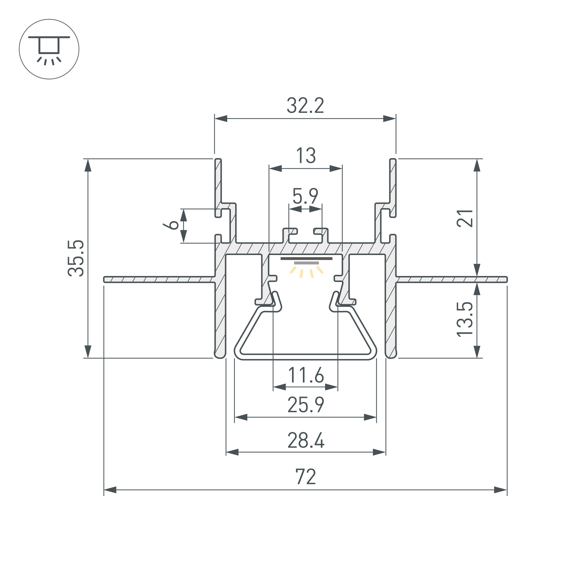 Встраиваемый алюминиевый профиль (центральная линия) для дизайнерских решений «линии света» в натяжных потолках. Решение 2-в-1: служит каркасом для крепления натяжного потолка и профилем для установки светодиодной ленты. Габаритные размеры профиля составляют 1000 мм в длину, 72 мм в ширину и 35,5 мм в высоту. Площадка для установки светодиодных лент позволяет использовать ленту шириной до 13 мм и мощностью до 40 Вт/м. Это обеспечивает гибкость в выборе светодиодных лент и создает потрясающие световые решения. Заглушки и другие аксессуары не включены в комплект и приобретаются отдельно. Цена указана за 1 метр профиля. Отличное решение для создания современных световых проектов.