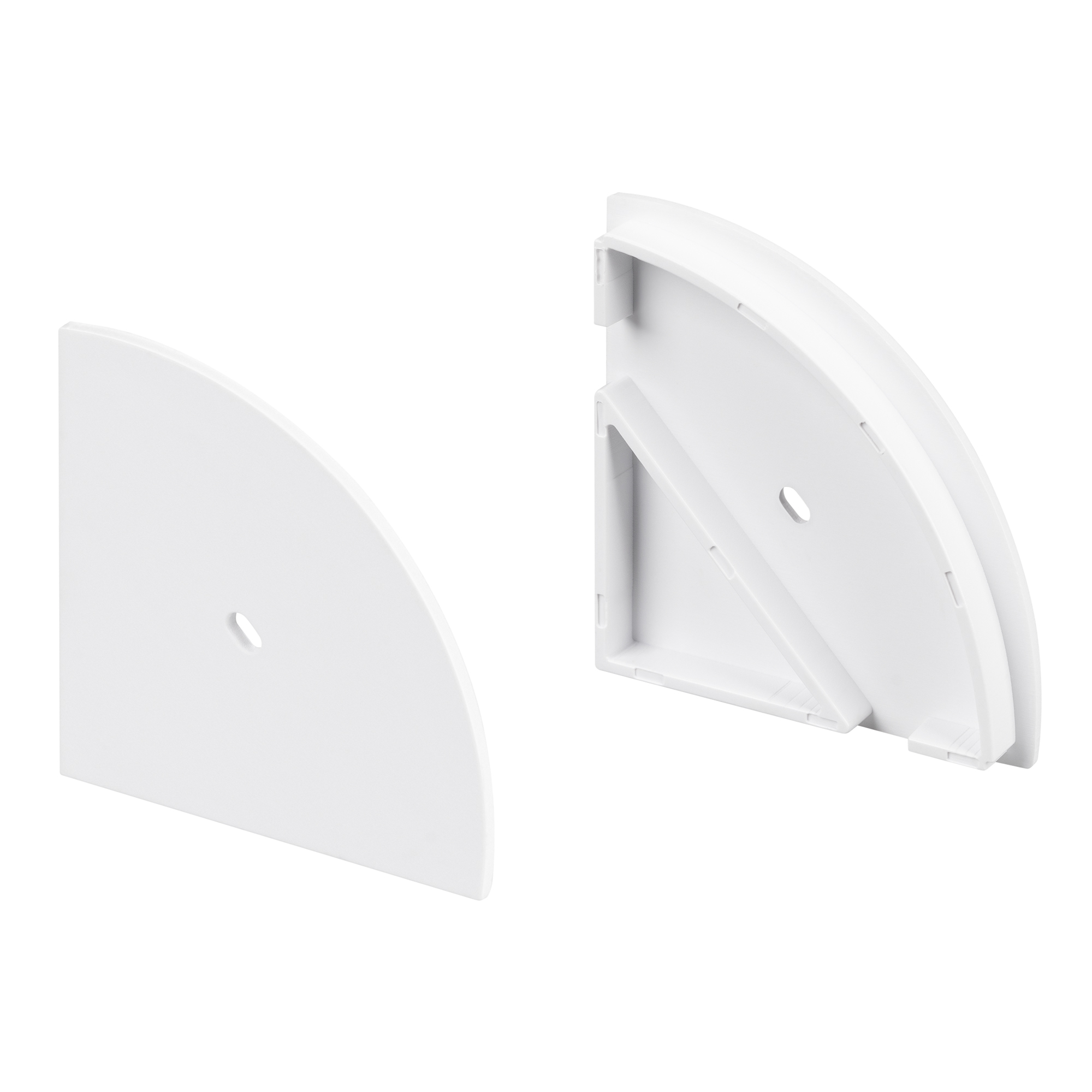 Серебристые заглушки (2 шт.) с отверстием для профиля KANT-H55 с полукруглым экраном. Придают законченный вид светильнику, а также защищают светодиодную ленту от внешних факторов (грязи, пыли и прочего). Отверстие в заглушке позволяет вывести кабель питания светодиодной ленты.