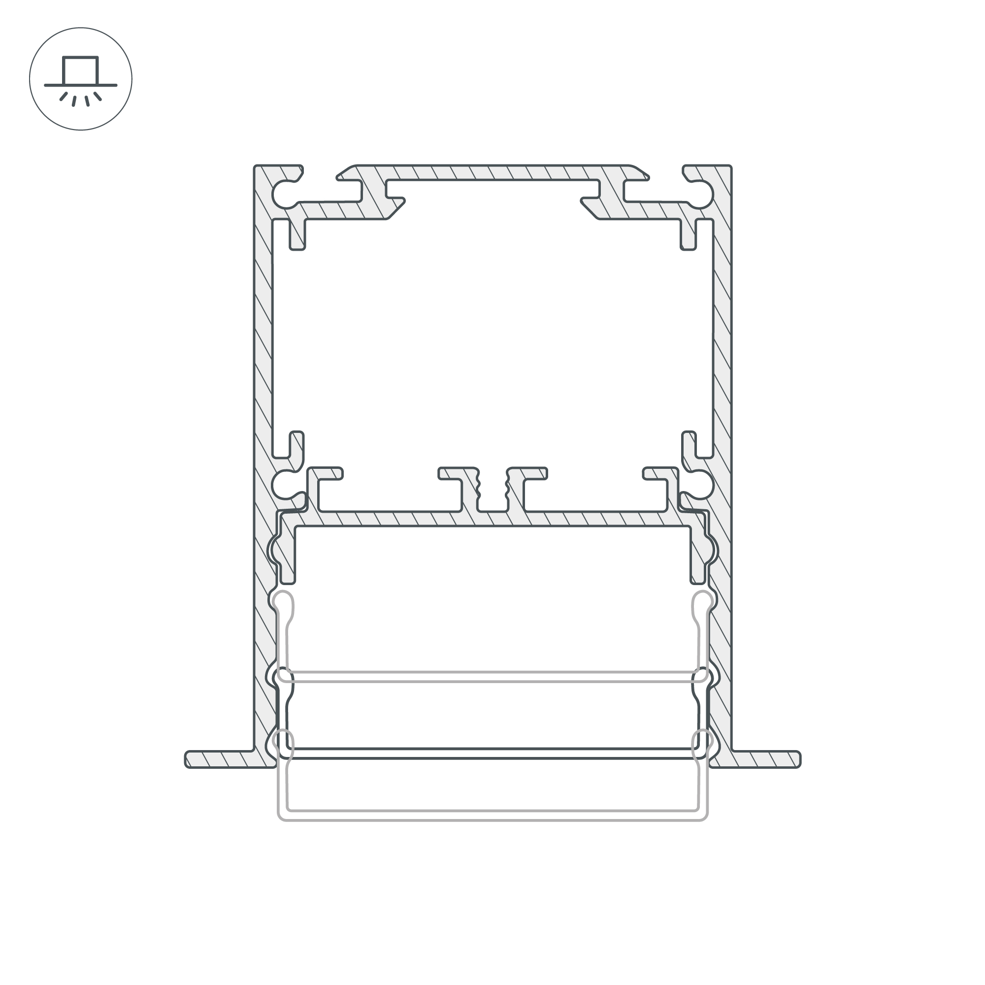 Встраиваемый профиль с накладным фланцем из анодированного алюминия для основного освещения и контурной подсветки. Возможность установки экрана на трех уровнях: выступая за края профиля, вровень с профилем и утоплено, позволяет получить разные световые эффекты.