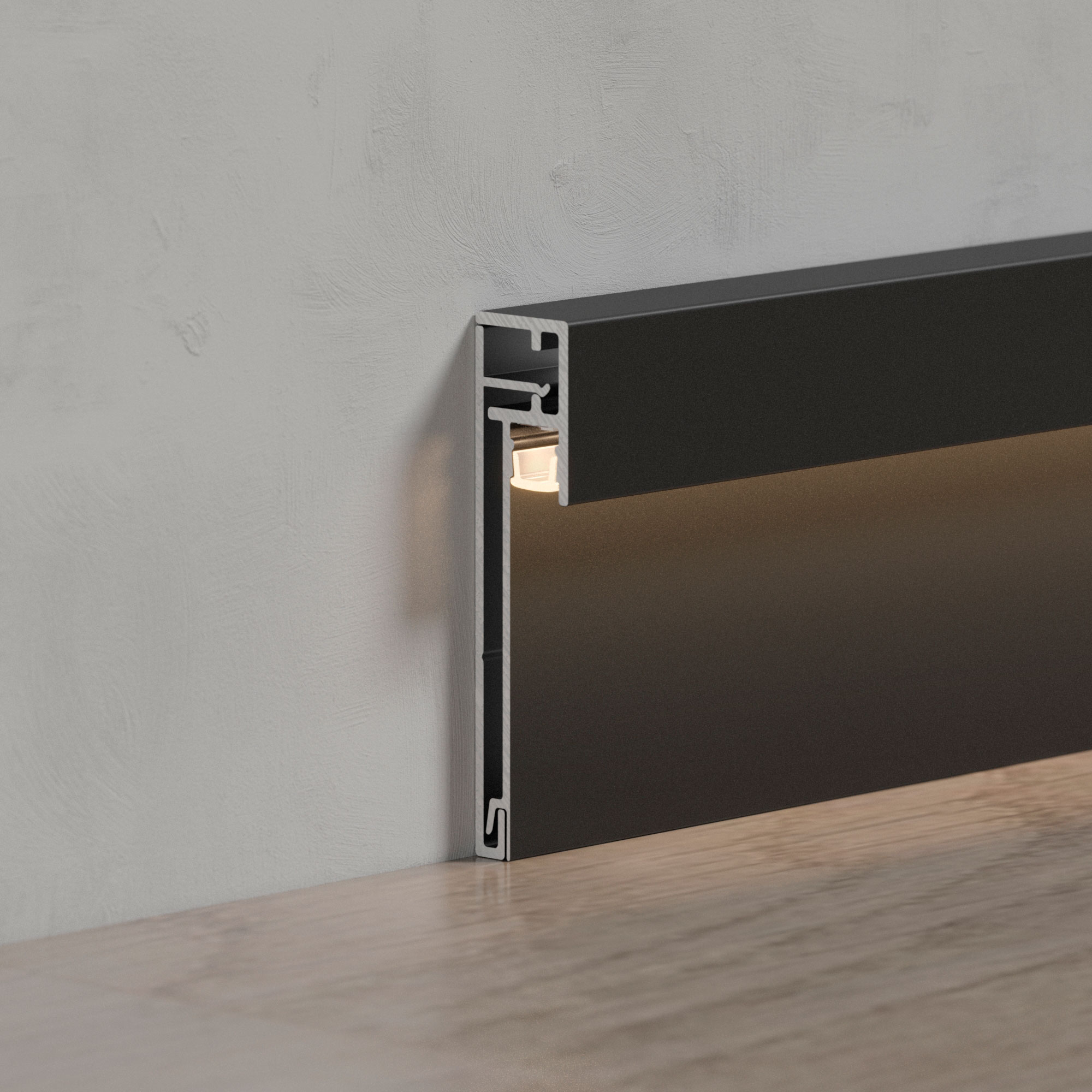 Алюминиевый накладной двухкомпонентный профиль-плинтус для светодиодных лент и линеек. Цвет - черный RAL9005 (порошковая окраска). Габаритные размеры (L×W×H): 2000x12,3x52,6мм. Ширина площадки для ленты 5 мм. Аксессуары приобретаются отдельно. Цена за метр.
