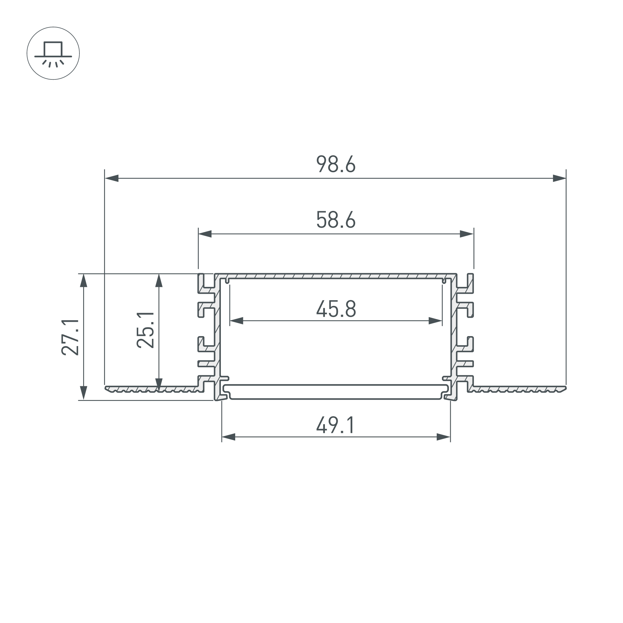 Алюминиевый встраиваемый профиль для светодиодных лент и линеек. Габаритные размеры (L×W×H): 2000х98,6х27.1 мм. Ширина площадки для ленты 45,8 мм. Экраны, заглушки и другие аксессуары приобретаются отдельно. Цена за 1 метр.
