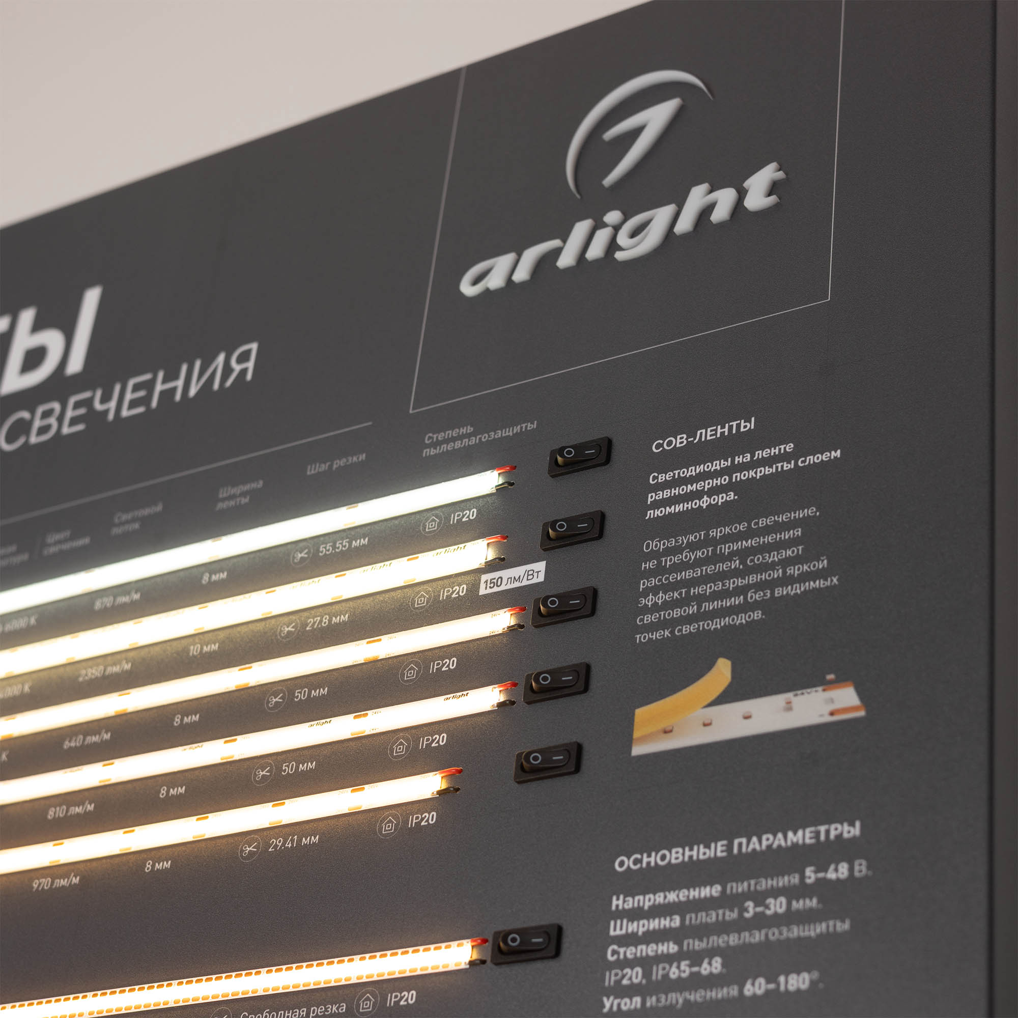 Стенд светодиодные ленты COB Материал - алюкобонд 3 мм, пленка, печать. Габаритные размеры (Ширина Х Высота Х Глубина), 600х830х60 мм. Питание 230 В.