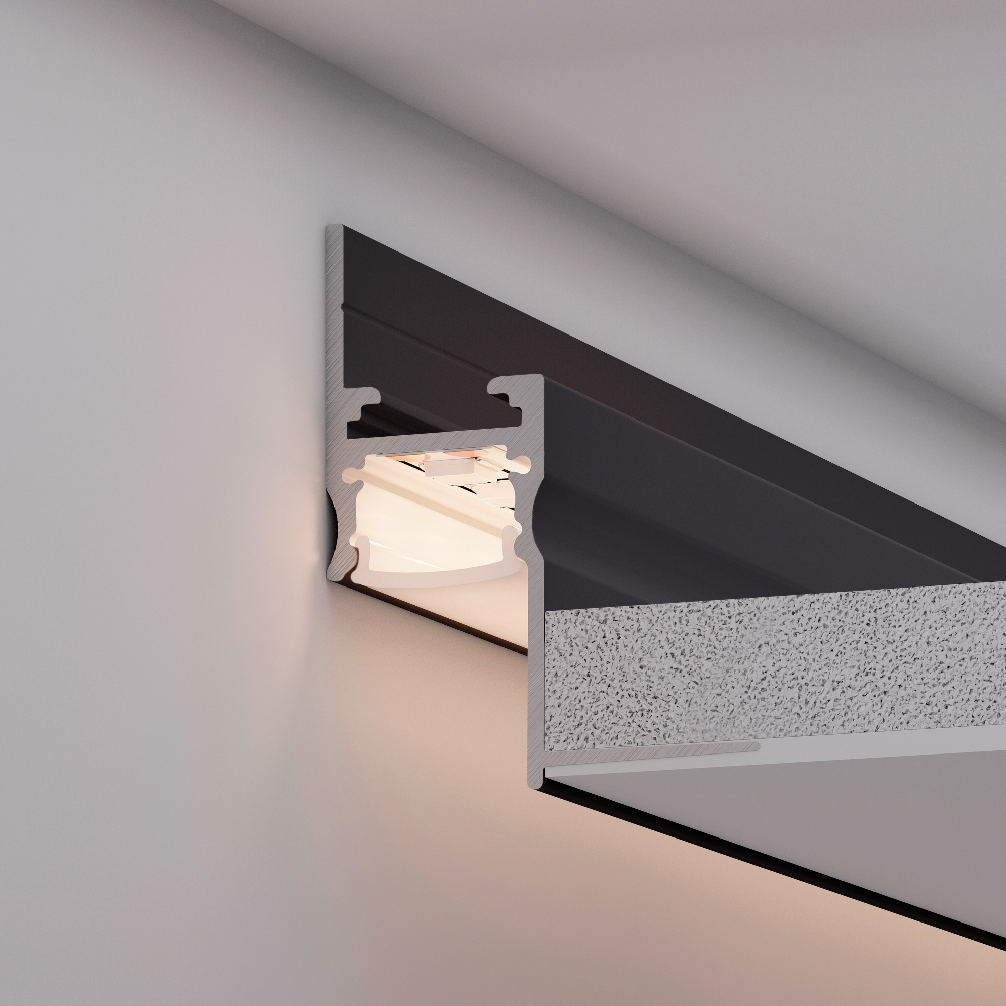 Встраиваемый алюминиевый профиль чёрного цвета со скрытым фланцем устанавливается в потолки и потолочные ниши из гипсокартона, образуя теневой зазор между потолком и стеной. Такое решение создает визуальный эффект потолка, парящего в воздухе с мягким свечением по периметру комнаты. Габаритные размеры профиля составляют 2000 мм в длину, 41 мм в ширину и 51 мм в высоту. Площадка для установки светодиодных лент позволяет использовать ленту шириной до 13,3 мм и мощностью до 47,7 Вт/м. Это обеспечивает гибкость в выборе светодиодных лент и создает потрясающие световые решения. Экраны, заглушки и другие аксессуары не включены в комплект и приобретаются отдельно. Цена указана за 1 метр профиля. Отличное решение для создания современных световых проектов.