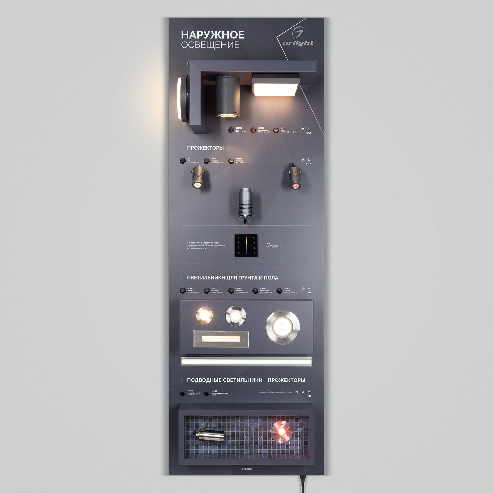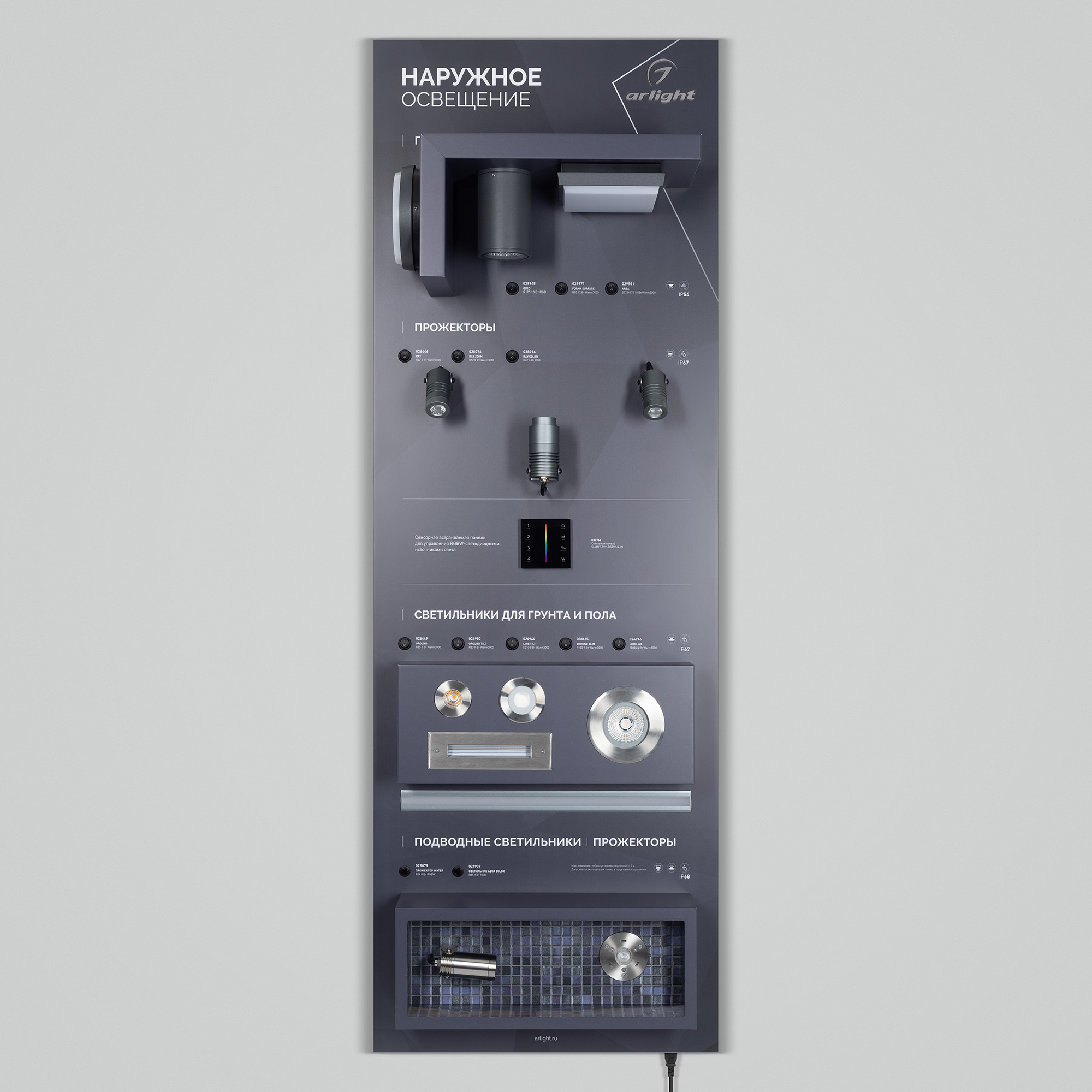 Стенд НАРУЖНОЕ ОСВЕЩЕНИЕ. Потолочные, напольные, грунтовые, подводные светильники и прожекторы. Материал - композит 3 мм, пленка, печать. Габаритные размеры (Ширина Х Высота Х Глубина), 600х1760х190 мм.