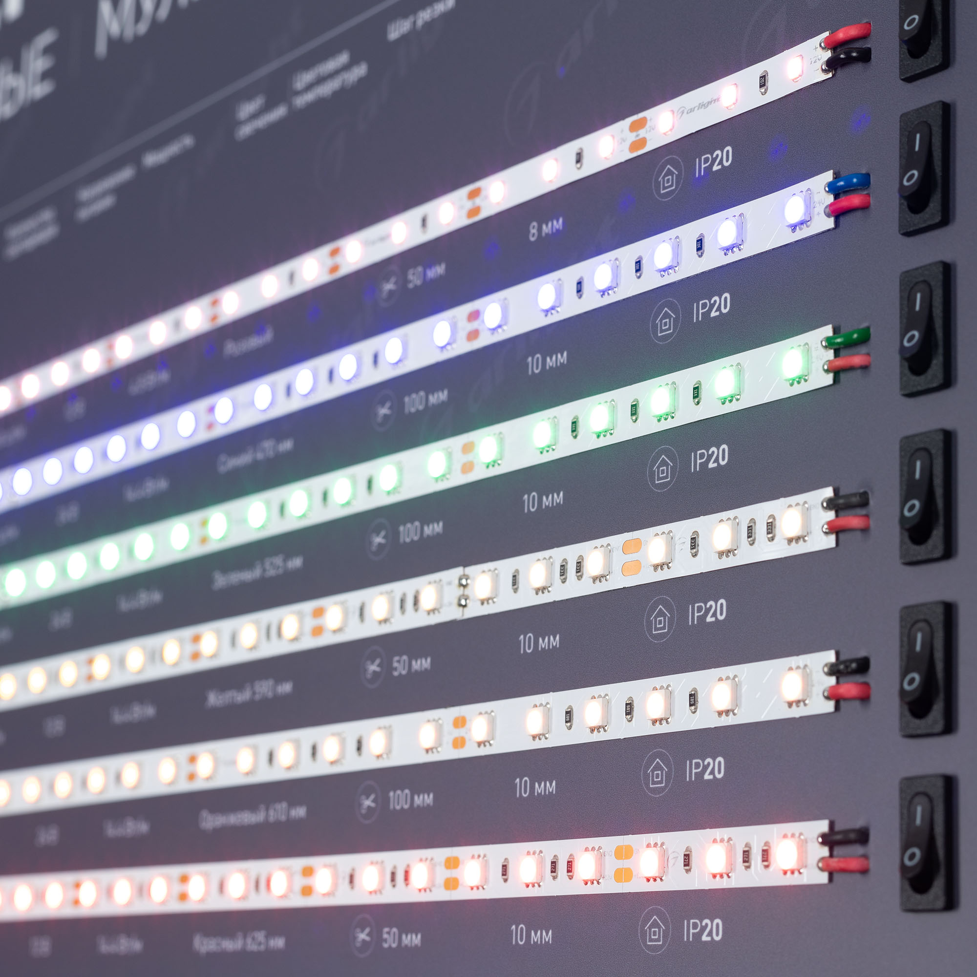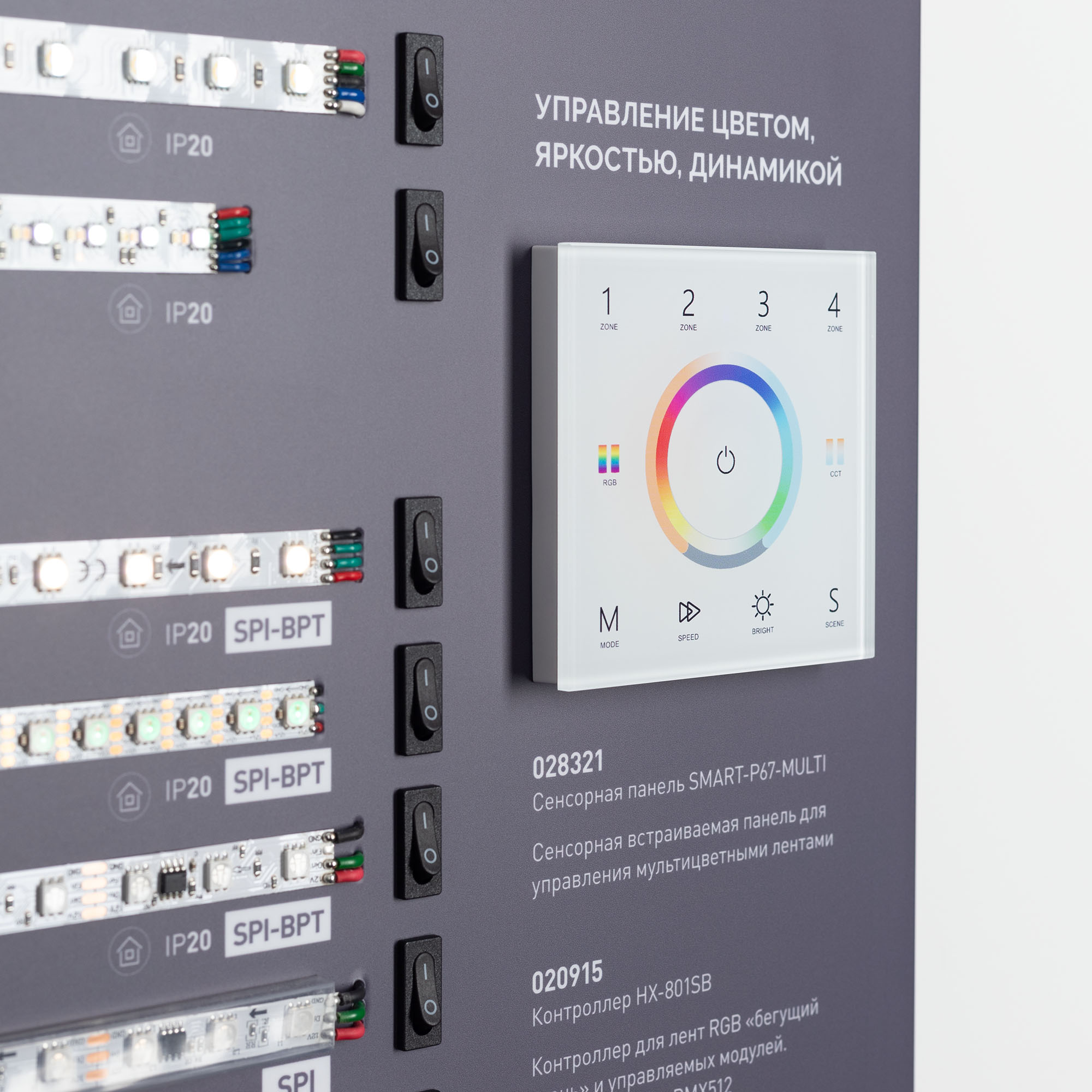 На стенде представлены различные мультицветные ленты: одноцветные, RGB, RGBW, динамические и непрерывные. Автоматические режимы управления, возможность ручной регулировки.