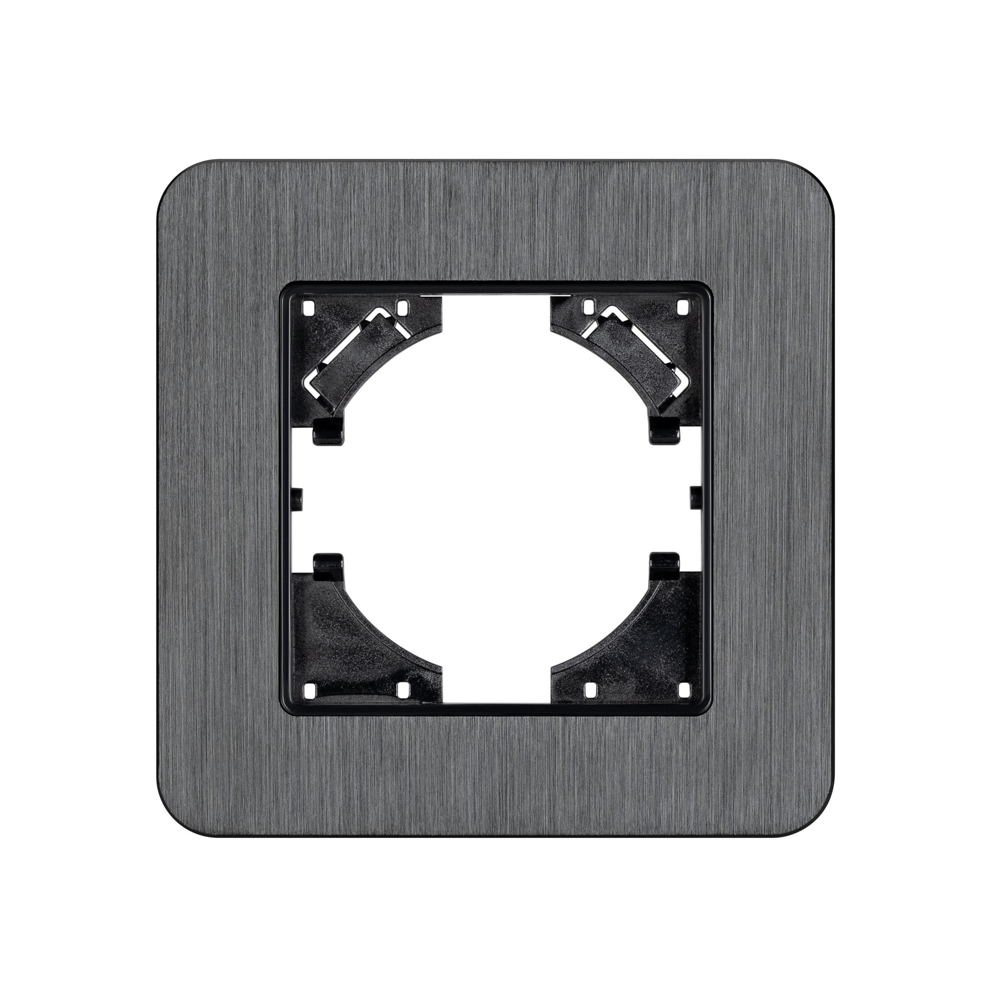 Рамка алюминиевая на 1 пост, под встраиваемый механизм. Цвет - черный. Уровень герметичности IP20. Ориентация монтажа - горизонтальная (основным ориентиром служат посадочные выступы для накладки механизма). Габаритные размеры: длина 86 мм, ширина 86 мм, высота 7 мм. Гарантийный срок 12 мес.