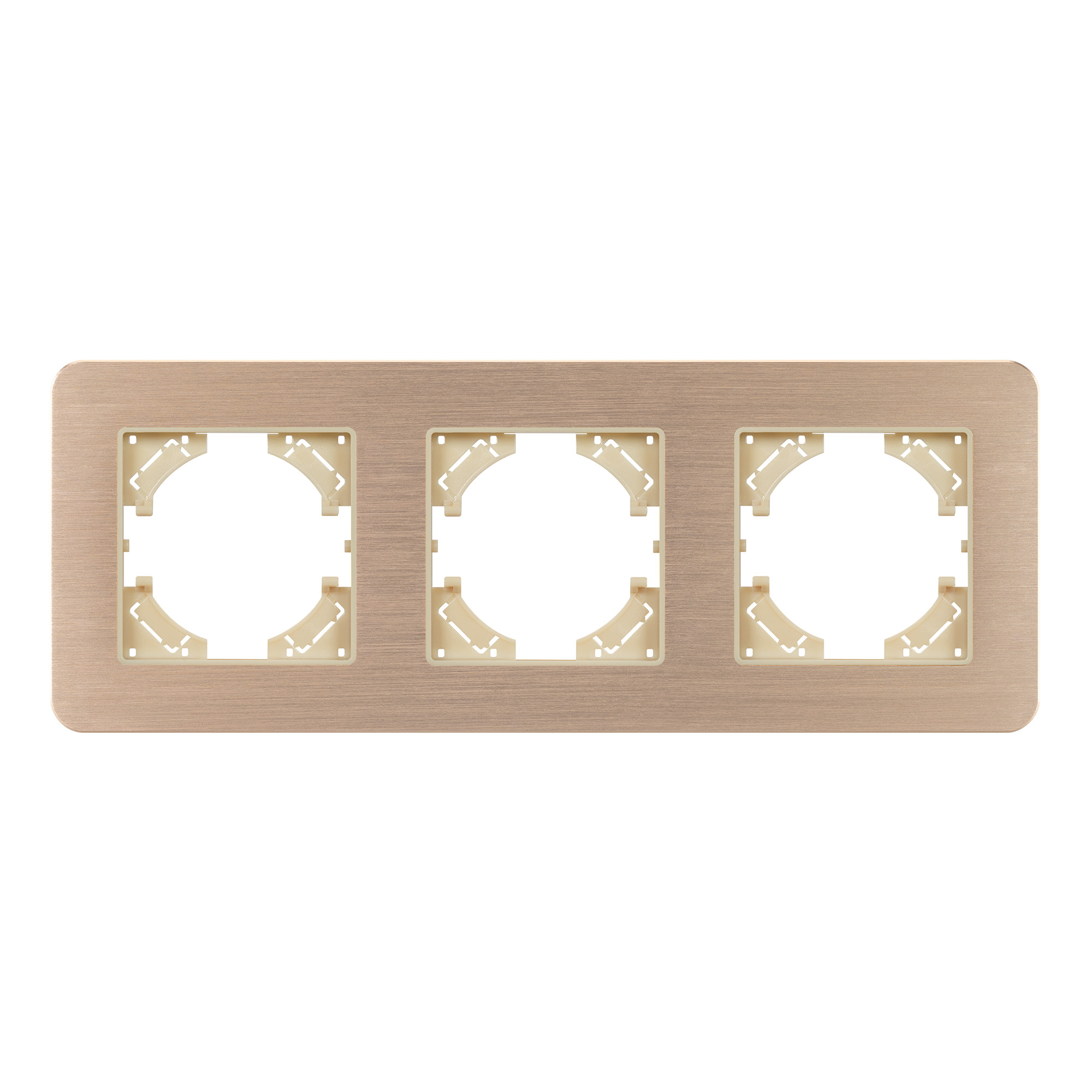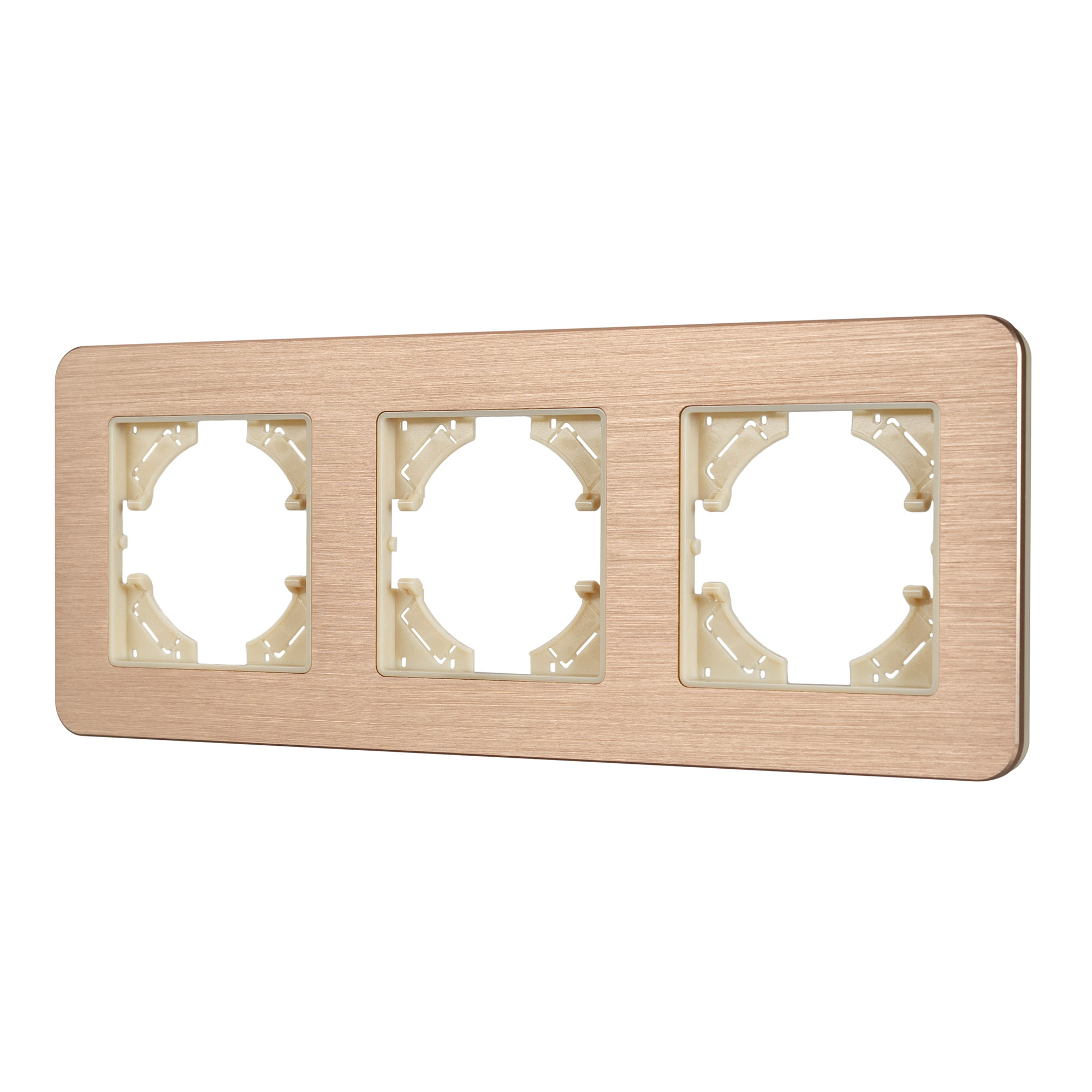 Рамка алюминиевая на 3 поста, под встраиваемый механизм. Цвет - золотой. Уровень герметичности IP20. Ориентация монтажа - горизонтальная (основным ориентиром служат посадочные выступы для накладки механизма). Габаритные размеры: длина 228 мм, ширина 86 мм, высота 7 мм. Гарантийный срок 12 мес.