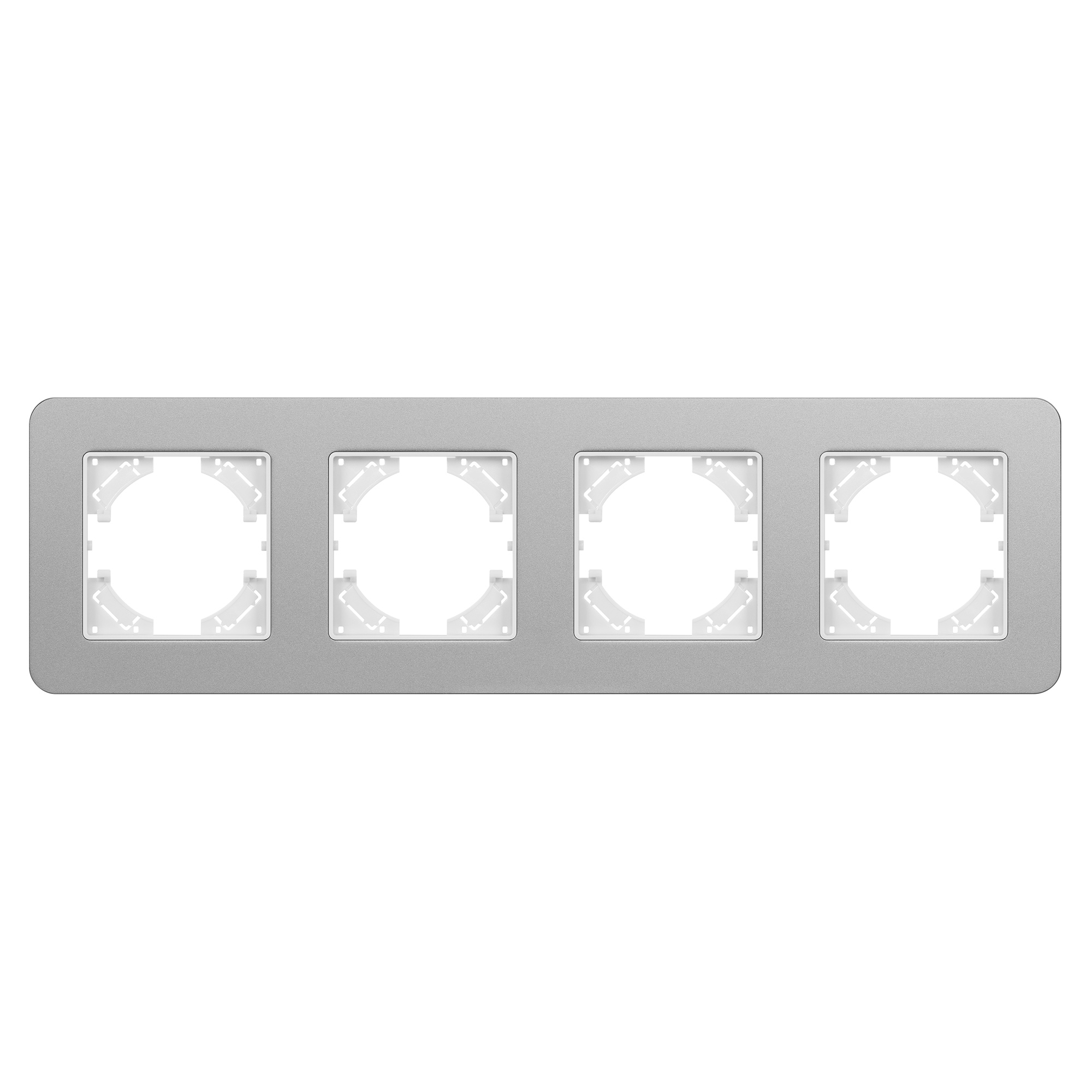 Рамка алюминиевая на 4 поста, под встраиваемый механизм. Цвет - серебристый с Soft-Touch покрытием. Уровень герметичности IP20. Ориентация монтажа - горизонтальная (основным ориентиром служат посадочные выступы для накладки механизма).