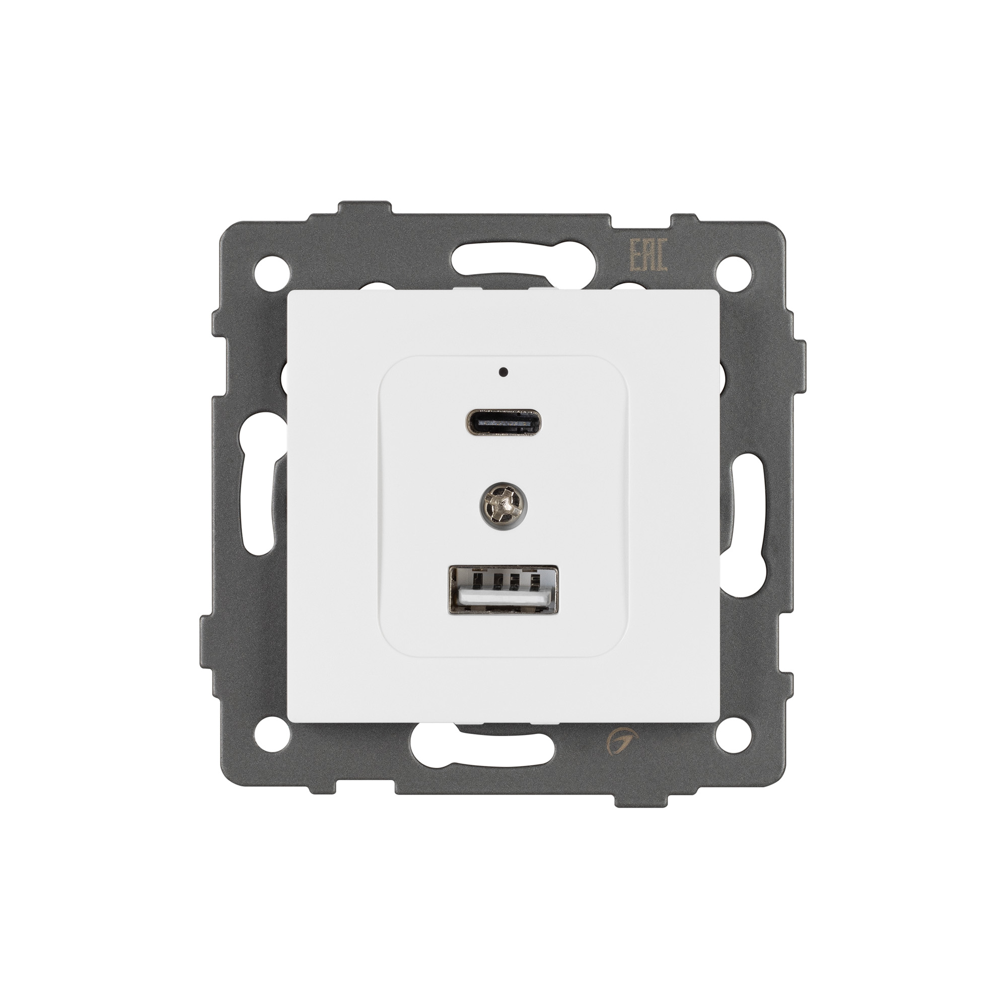 Механизм розетки с заземлением на 2 USB Type A+C порта. Цвет - белый. Без фронтальной рамки. Уровень пылевлагозащиты IP20. Устанавливается в стандартный подрозетник. Габаритные размеры: длина 71 мм, ширина 71 мм, высота 42 мм. Гарантийный срок 10 лет.