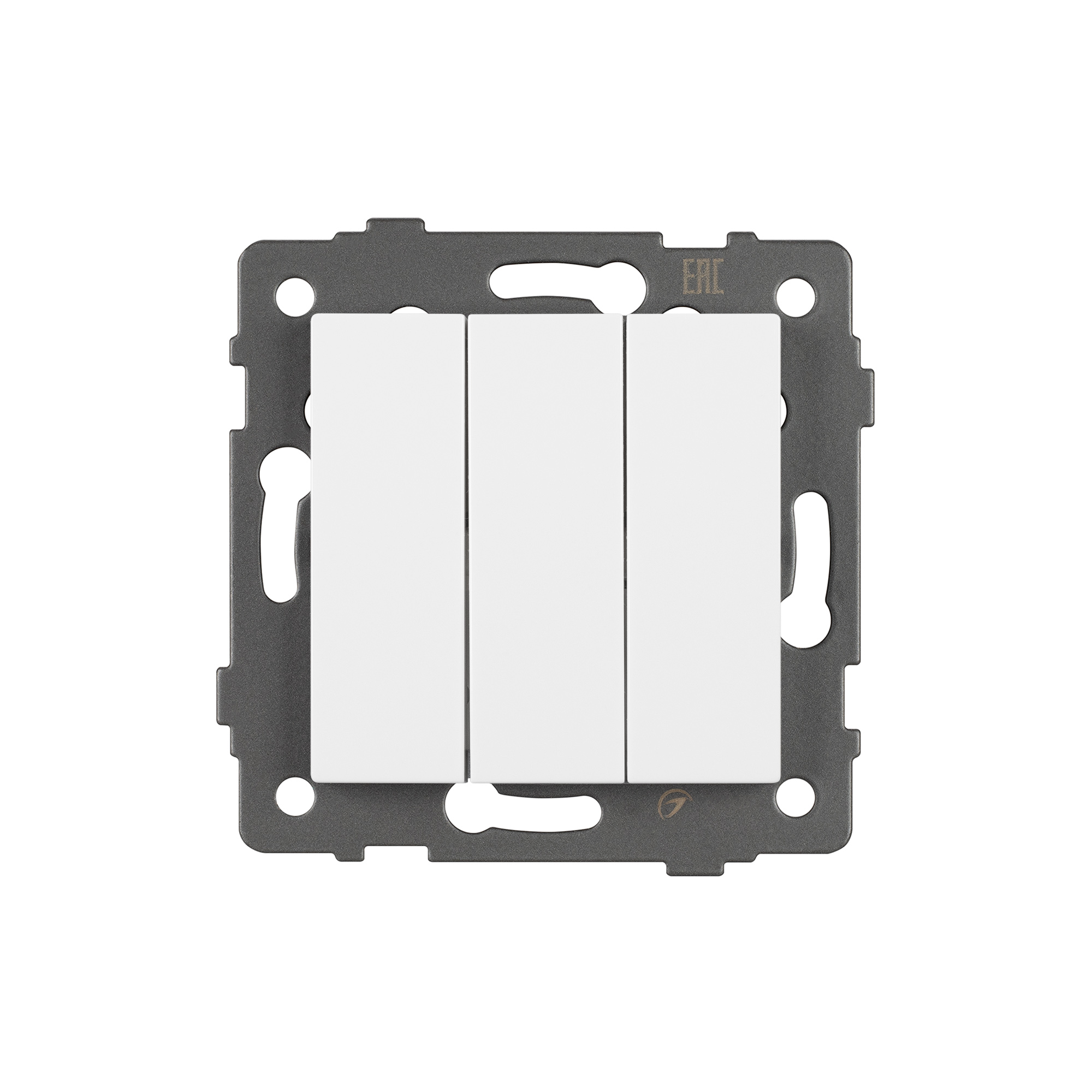 Механизм выключателя света клавишный на 1 пост 3 клавиши (непроходной). Цвет - белый. Без фронтальной рамки. Уровень пылевлагозащиты IP20. Выключатель устанавливается в стандартный круглый подрозетник.