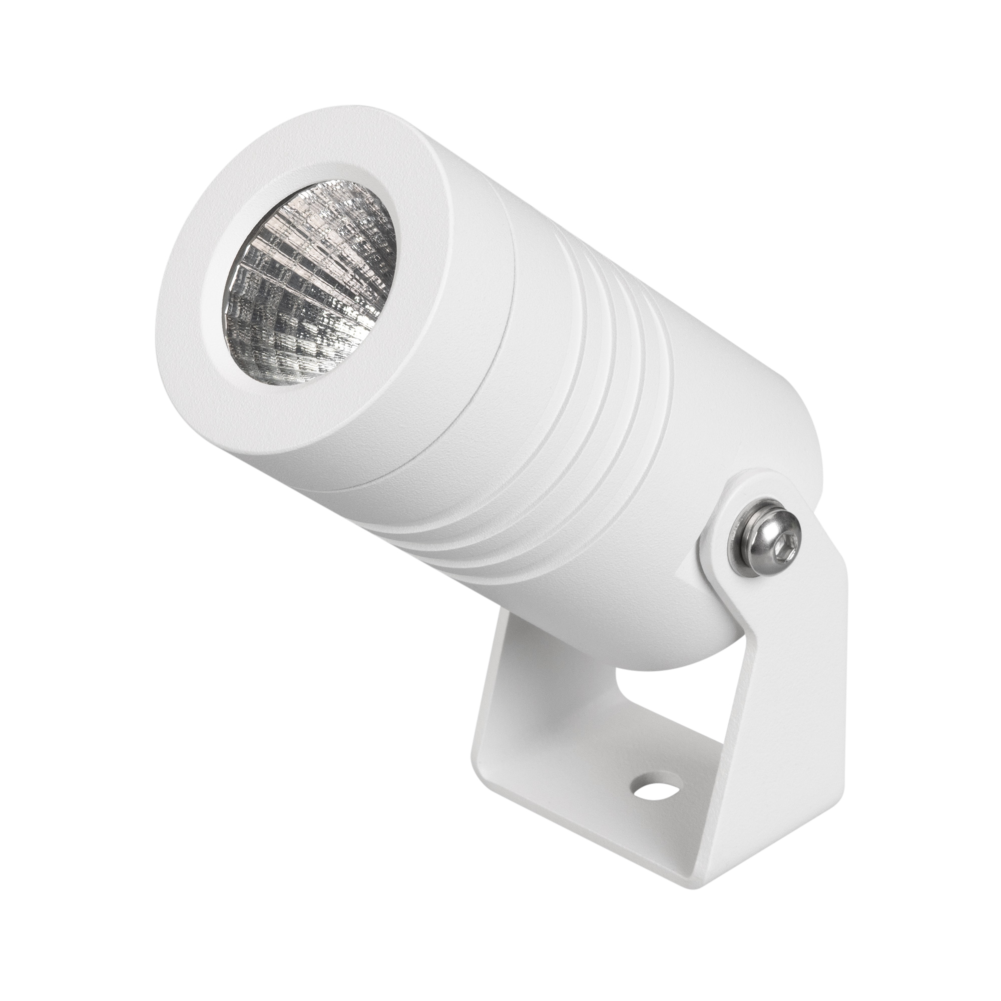Уличный светодиодный прожектор, мощность 5Вт, угол освещения 25°. Цвет ТЕПЛЫЙ 3000К, световой поток 310лм. Влагозащищенный корпус IP67 - белый алюминий, экран из закалённого стекла. Угол поворота корпуса в вертикальной плоскости 135°. Питание 230В, мощность 5 Вт. Размеры DxH -Ø42х77мм. В комплекте 1м провод.