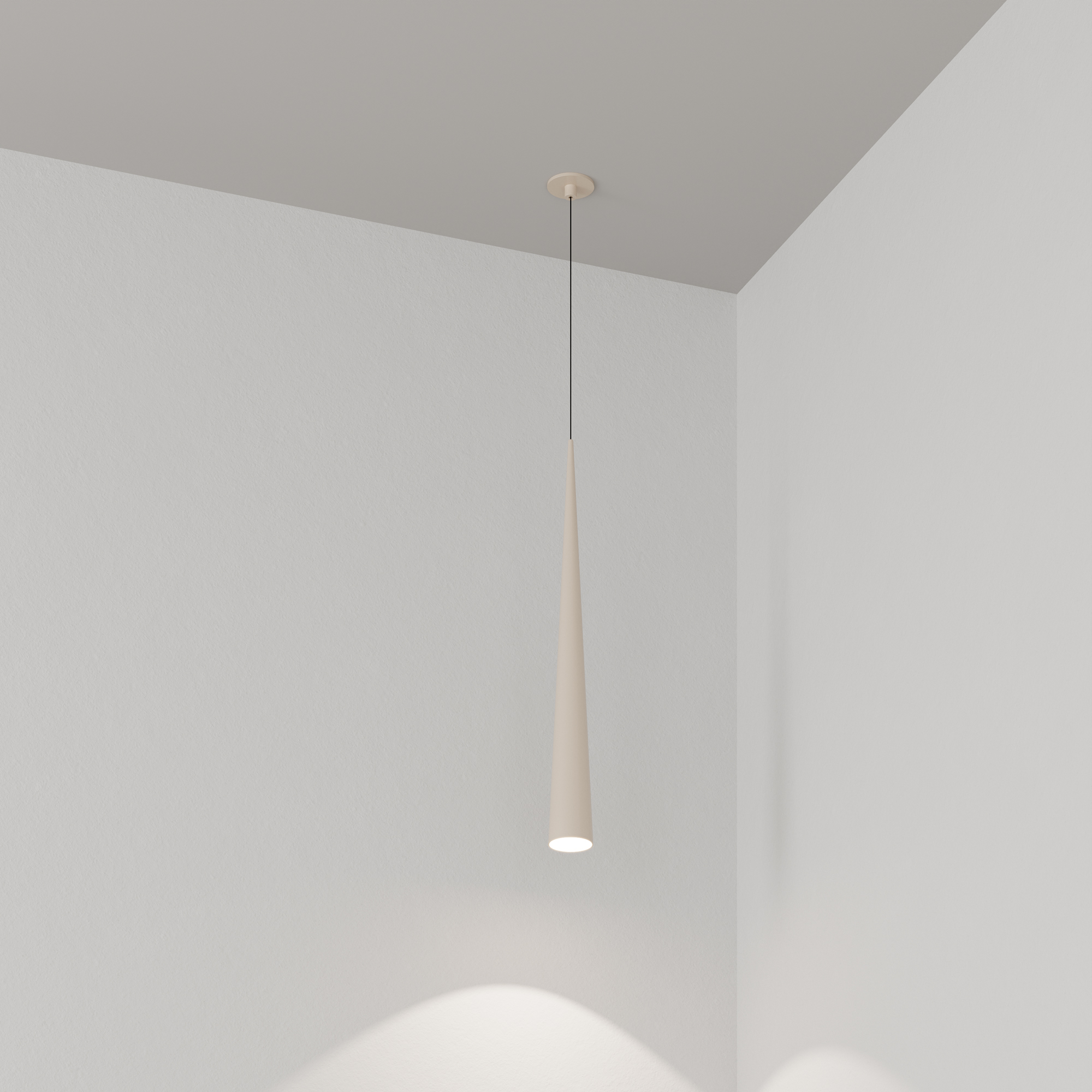 Подвесной светильник. Мощность 5 Вт, св. поток 400 лм, 70 лм/Вт, теплый 2700 K, CRI>92, угол 36°, напряжение питания 230 В. Кремовый конусообразный вытянутый корпус из алюминия, линза из PMMA, степень защиты IP20. Размер: диаметр 76 мм, высота 670 мм. Монтаж подвесной, длина подвеса 1330 мм, регулируемая. В комплекте 2 вида чаш. Габариты встраиваемой чаши: Ø 80x41 мм. Габариты накладной чаши Ø80x60 мм. Драйвер 2,8-12В, 500 мА, пульсация <1%.