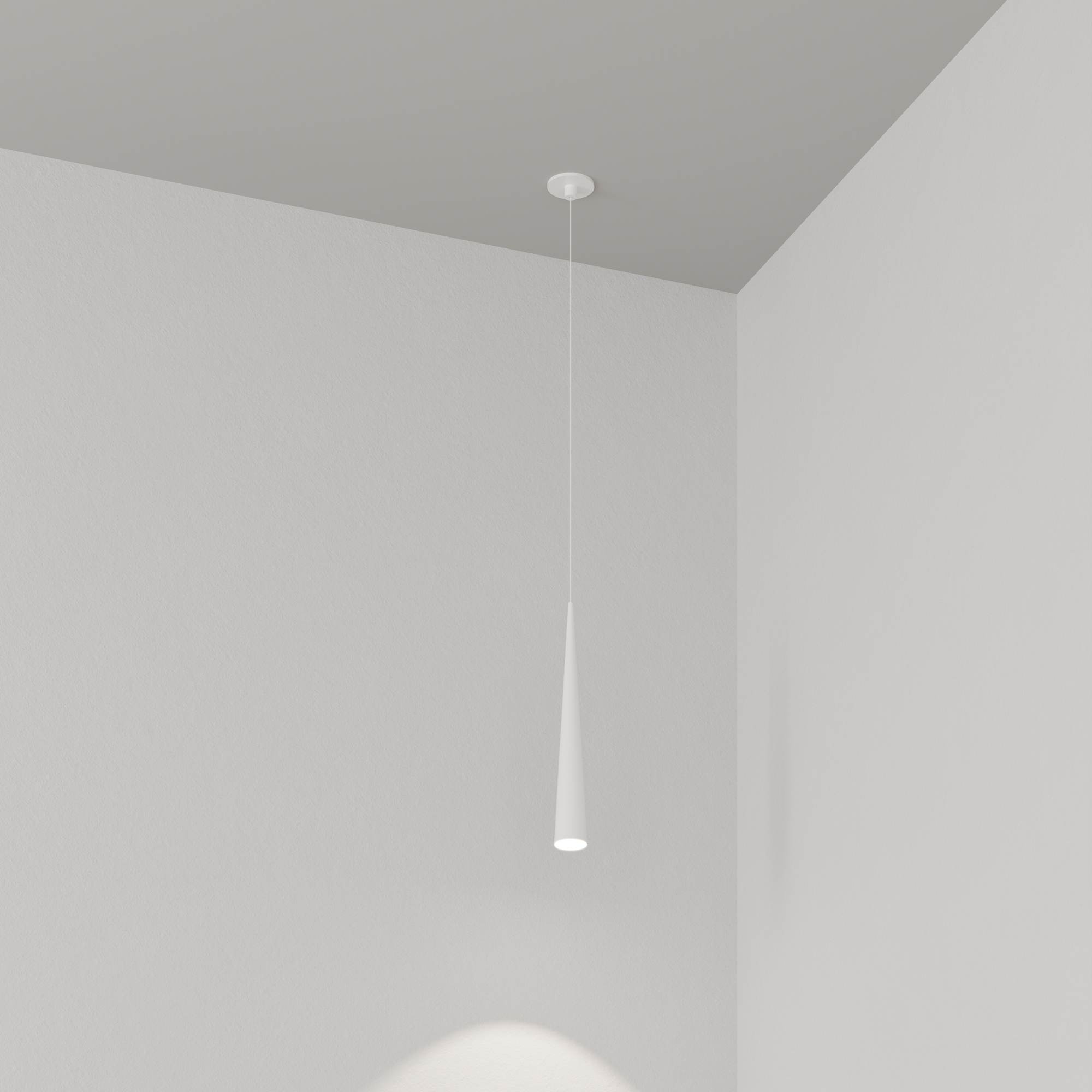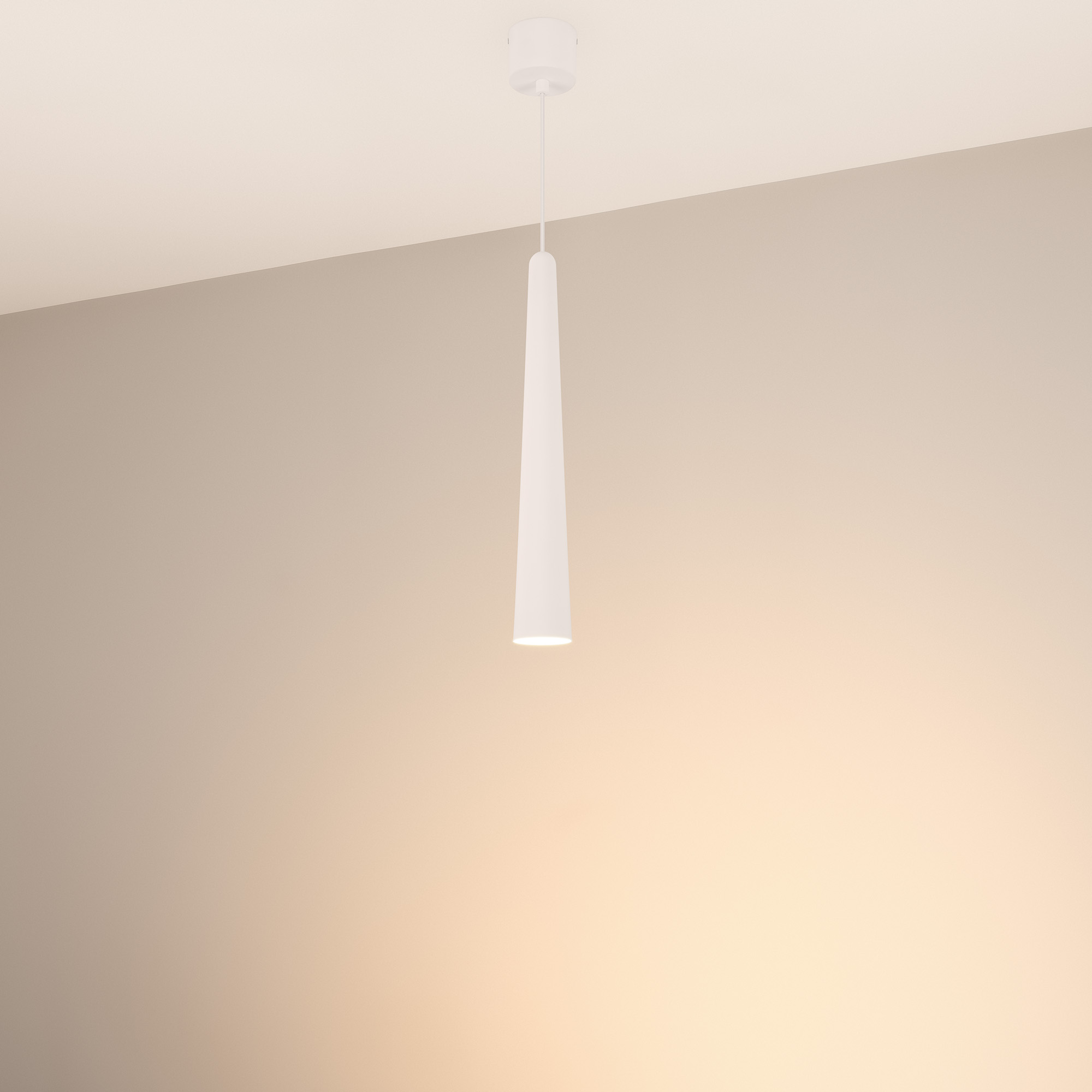 Подвесной светильник. Мощность 5 Вт, св. поток 400 лм, световая эффективность 70 лм/Вт, теплый 2700 K, CRI>92, угол 36°, напряжение питания 230 В. Белый конусообразный вытянутый корпус из алюминия, линза из PMMA, степень защиты IP20. Размер: диаметр 57 мм, высота 400 мм. Монтаж подвесной, длина подвеса 2000 мм, регулируемая. В комплекте 2 вида чаш. Габариты встраиваемой чаши: Ø 80x41 мм. Габариты накладной чаши Ø80x60 мм. Драйвер 2,8-12В, 500 мА, пульсация <1%.