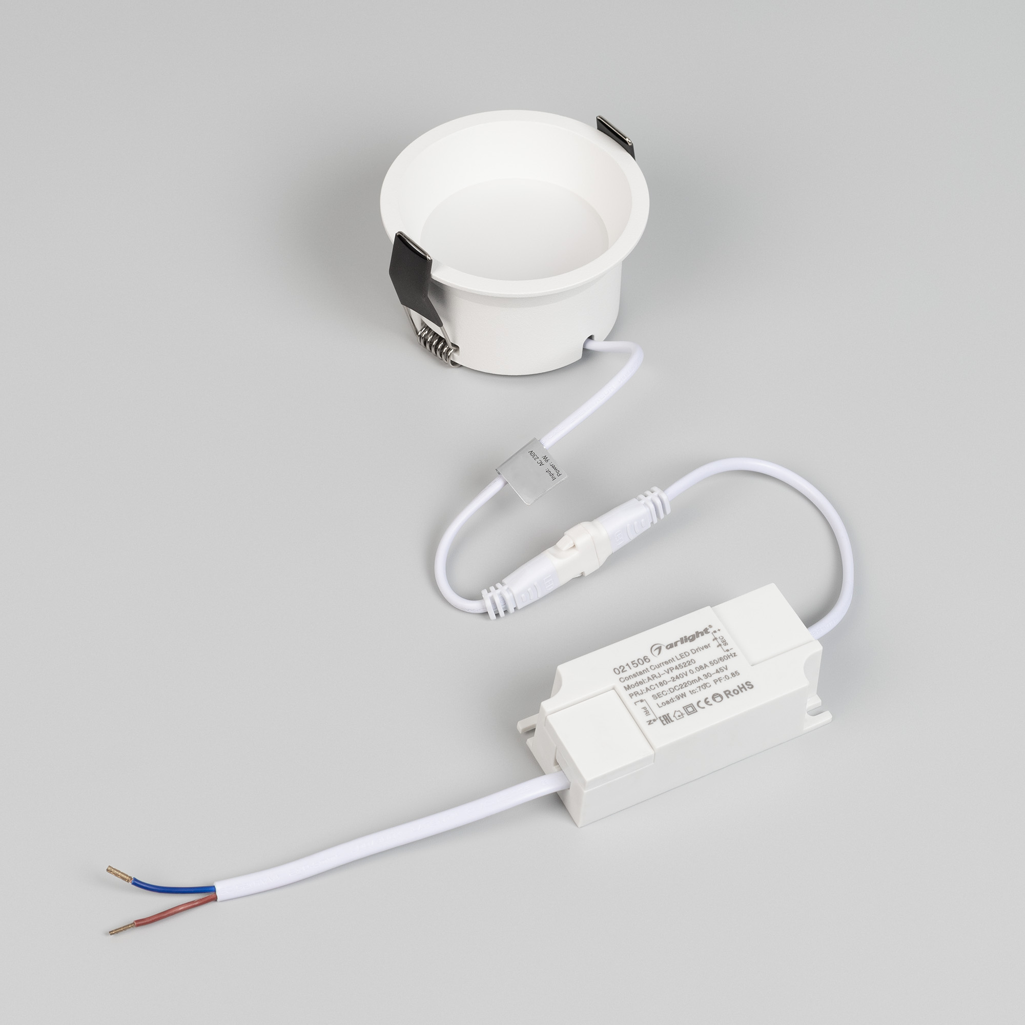 Встраиваемый светильник даунлайт. Мощность 9 Вт, св. поток 595 лм, 66 лм/Вт, тёплый 2700 K, CRI>90, угол 85°, напряжение питания 230 В. Белый круглый корпус из алюминия, степень защиты IP20. Размер: диаметр 82 мм, высота 46 мм. Монтаж встраиваемый, установочное отверстие: диаметр 75 мм. Драйвер 27-42 В, 200 мА, пульсация <2%.