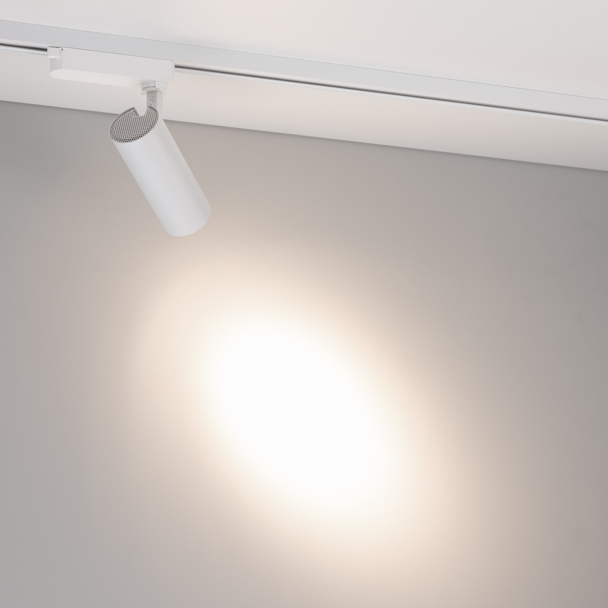 Светильник для треков/шин 2 провода. Мощность 10 Вт, св. поток без решетки honeycomb 1000 лм, 100 лм/Вт, с решеткой honeycomb 660 лм, 66 лм/Вт, дневной 4000 K, CRI>90, угол 15°, напряжение питания 230 В. Белый круглый корпус из алюминия, материал линзы PMMA, степень защиты IP20. Антибликовая решетка honeycomb в комплекте. Размер: диаметр 55 мм, длина световой части 141 мм. Монтаж на трек 1-фазный. Драйвер встроенный 25-40 В, 250мА., пульсация <5%.