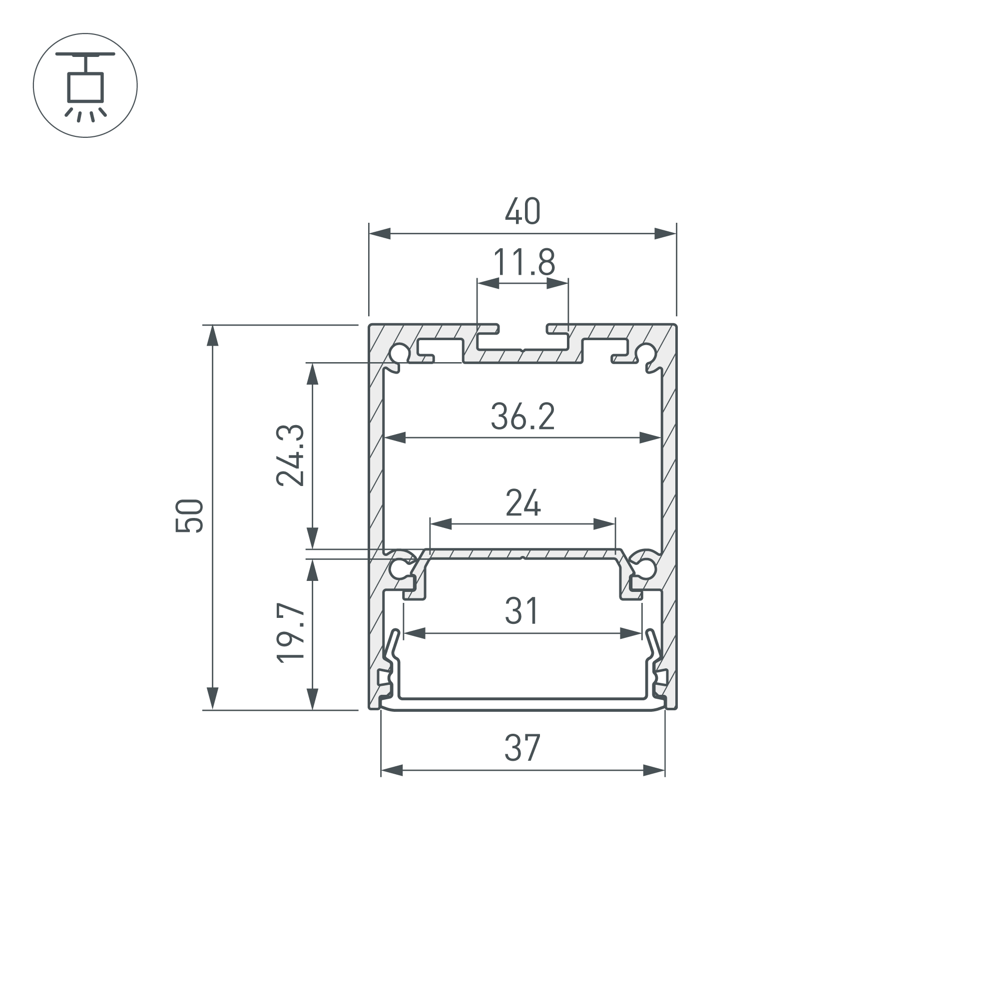 Накладной/подвесной профиль из анодированного алюминия серебристого цвета для основного освещения с возможностью герметизации до IP54 с помощью аксессуаров к профилю (уплотнительная резинка, заглушки, экраны, муфты) без дополнительного использования силиконового герметика, до IP65 с помощью аксессуаров к профилю (уплотнительная резинка, заглушки, экраны, муфты) при условии дополнительного использования силиконового герметика. Габаритные размеры профиля составляют 2000 мм в длину, 40 мм в ширину и 50 мм в высоту. Площадка для установки светодиодных лент позволяет использовать ленту шириной до 24 мм и мощностью до 36 Вт/м. Это обеспечивает гибкость в выборе светодиодных лент и позволяет создать потрясающие световые решения. Экран, заглушки и другие аксессуары не включены в комплект и приобретаются отдельно. Цена указана за 1 метр профиля. Отличное решение для создания современных световых проектов.