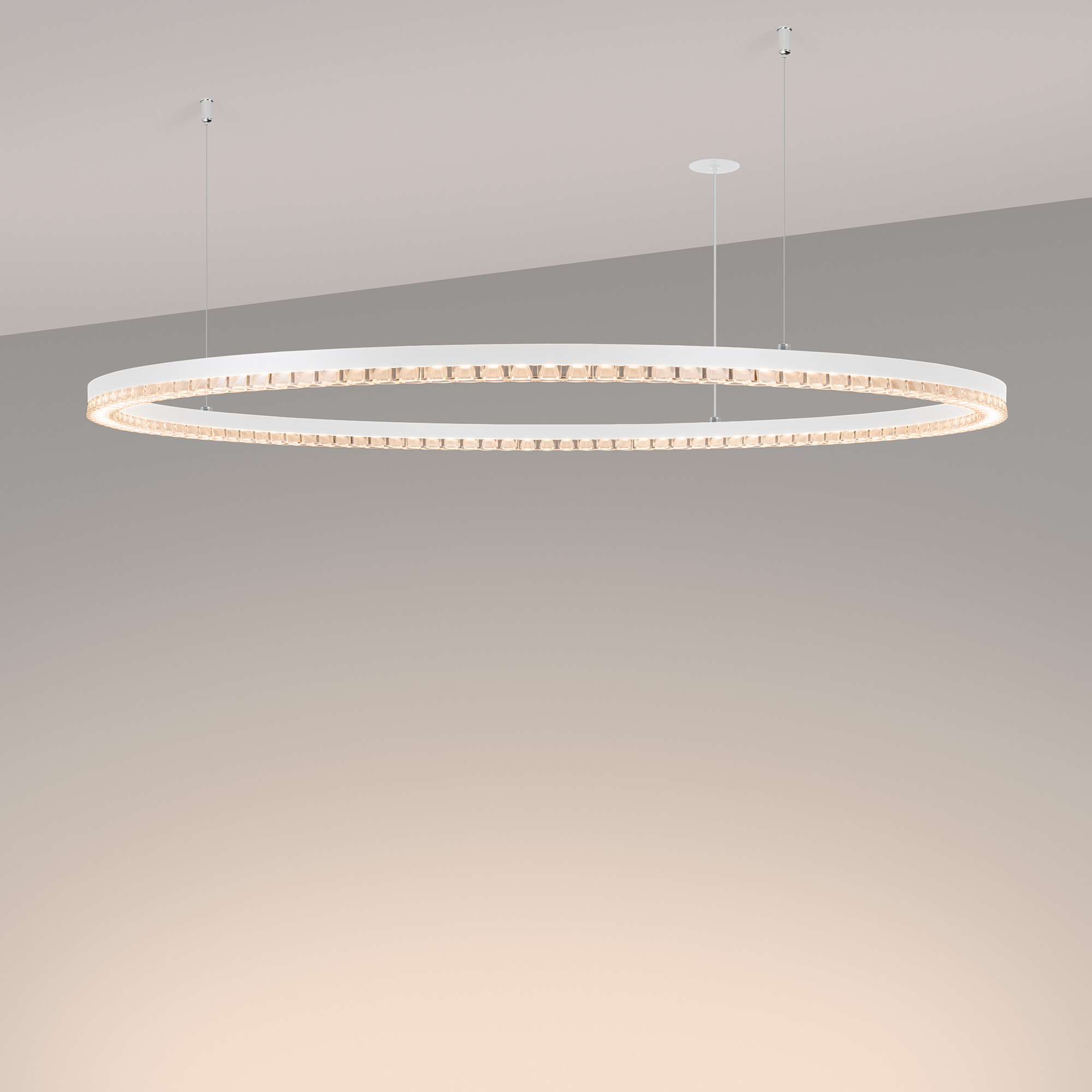 Под заказ. Подвесной светильник. Мощность 60 Вт, св. поток 5070 лм, 80-95 лм/Вт, теплый 3000 K, CRI>90, угол 45°, напряжение питания 230 В. Белый круглый корпус из алюминия, экран PMMA, степень защиты IP20. Размер: диаметр 1050 мм, высота 34 мм, ширина профиля 30 мм, размер чаши: диаметр 65 мм, высота 26 мм. Монтаж подвесной, длина подвеса 1200 мм, тип чаши встраиваемый, диаметр установочного отверстия чаши 60 мм. Драйвер (2шт.) 9-42 В, 700 мА. Пульсация <0,3 %.