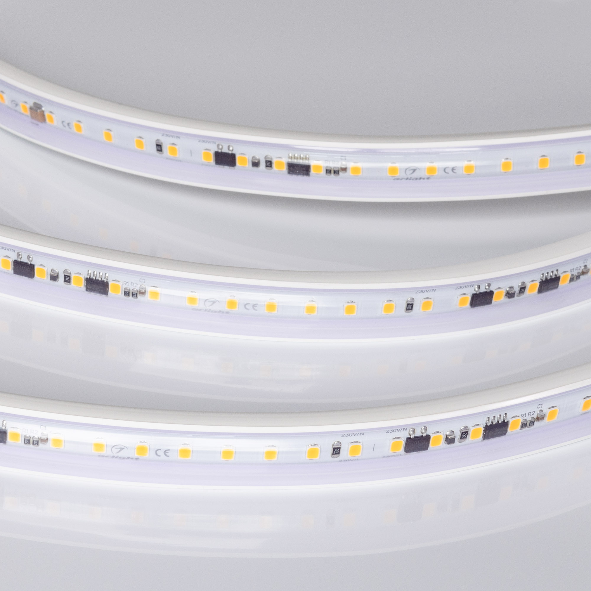Светодиодная герметичная лента ARL серии A120 со степенью защиты IP65, защитная оболочка из ПВХ устойчива к УФ излучению, что позволяет использовать ее на улице. Высокий индекс цветопередачи CRI>85 обеспечивает точное восприятие цветовых оттенков. Лента подключается непосредственно к сети переменного тока 230 В и не требует использования источников питания. Наличие интегральных стабилизаторов тока позволяет подключать ленту длиной до 10 м, обеспечивая при этом равномерную яркость свечения по всей длине ленты. При подключении нескольких лент необходимо подавать питание на каждые 10 м отдельным кабелем, последовательное подключение лент более 10 м запрещается. Лента применяется для подсветки потолочных ниш, декоративной подсветки, создания контуров рекламных объектов, может использоваться в помещениях и на улице. На лентах установлены микросхемы с функцией снижения тока для защиты ленты от перегрева, обеспечивающие надежную работу в различных условиях. Диммирование в диапазоне 30%-90% осуществляется TRIAC диммерами с установкой минимального уровня яркости. Крепление с помощью скоб, аксессуары для монтажа и подключения поставляются отдельно. Поставка под заказ от 100 м.