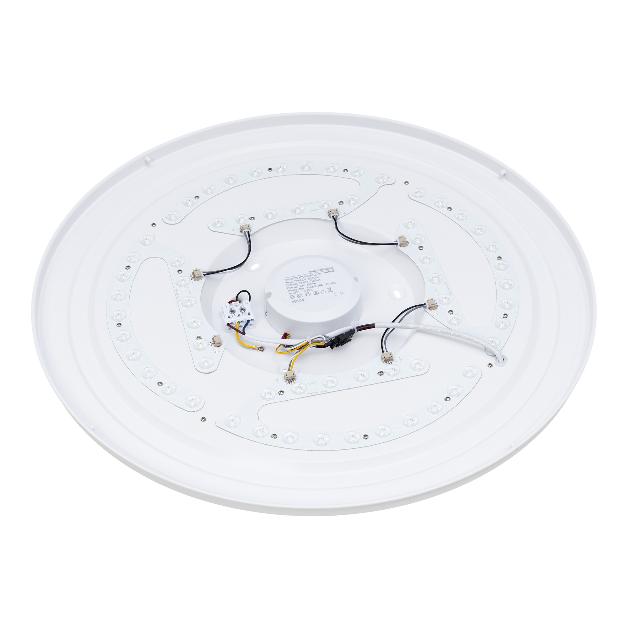 Светодиодный светильник с изменяемой цветовой температурой в диапазоне от 2700К до 6500К, с верхней подсветкой RGB. Мощность полная 50 Вт, св. поток 3000-3750 лм, 60-75 лм/Вт, CRI>90, угол 100°, напряжение питания 230 В. Белый круглый корпус из пластика, экран PC, степень защиты IP20. Размер: диаметр 570 мм, ширина 600 мм, высота 114 мм. Монтаж накладной. Драйвер TUYA Zigbee 23-40 В, 1300 мА, пульсация <5%. Мобильное приложение Smart Life или Intelligent Arlight для iOS и Android.