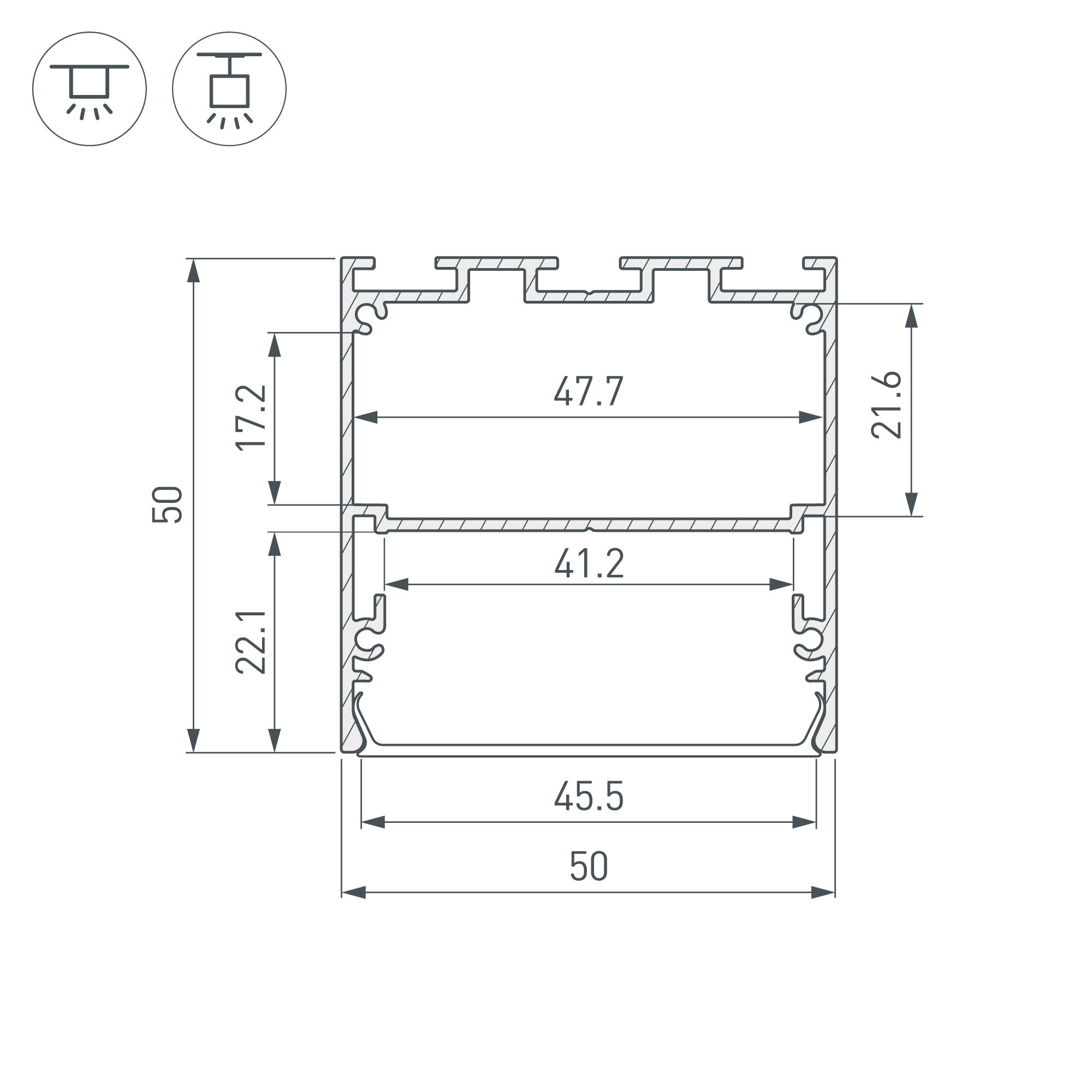 Подвесной/накладной профиль черного цвета из алюминия с отсеком для блока питания (40х21,6 мм) для основного освещения и контурной подсветки. Габаритные размеры профиля составляют 2500 мм в длину, 50 мм в ширину и 50 мм в высоту. Площадка для установки светодиодных лент позволяет использовать ленту шириной до 41,2 мм и мощностью до 52,5 Вт/м. Это обеспечивает гибкость в выборе светодиодных лент и создает потрясающие световые решения. Экраны, заглушки и другие аксессуары не включены в комплект и приобретаются отдельно. Цена указана за 1 метр профиля. Отличное решение для создания современных световых проектов. При изготовлении светильников длиной, превышающей длину профиля, соединители необходимо крепить к стенками профиля винтами с минимальным усилием, до первого ощущения сопротивления.