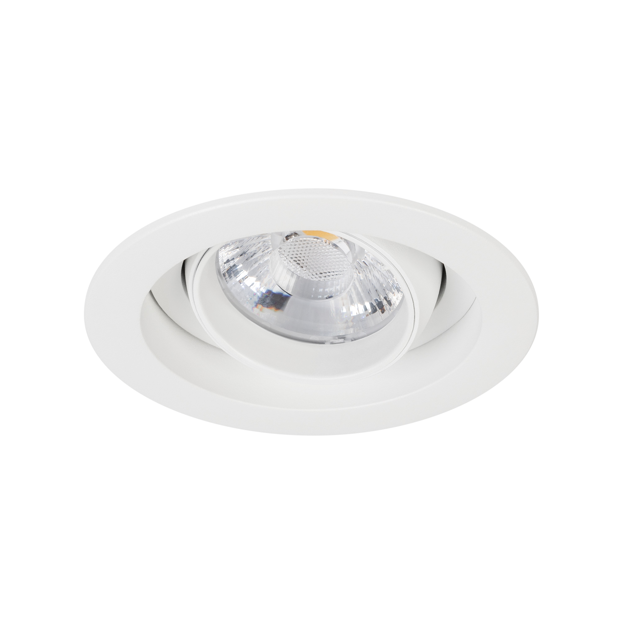 Встраиваемый карданный светильник. Мощность 12 Вт, св. поток 1318 лм, 109 лм/Вт, дневной 4000 K, CRI>92, угол 20°, напряжение питания 230 В. Белый корпус из алюминия, белая вставка, степень защиты IP20. Размер: диаметр 90 мм, высота 80 мм. Монтаж встраиваемый, установочное отверстие: диаметр 75 мм. Драйвер 27-40 В, 300 мА, пульсация <2%.