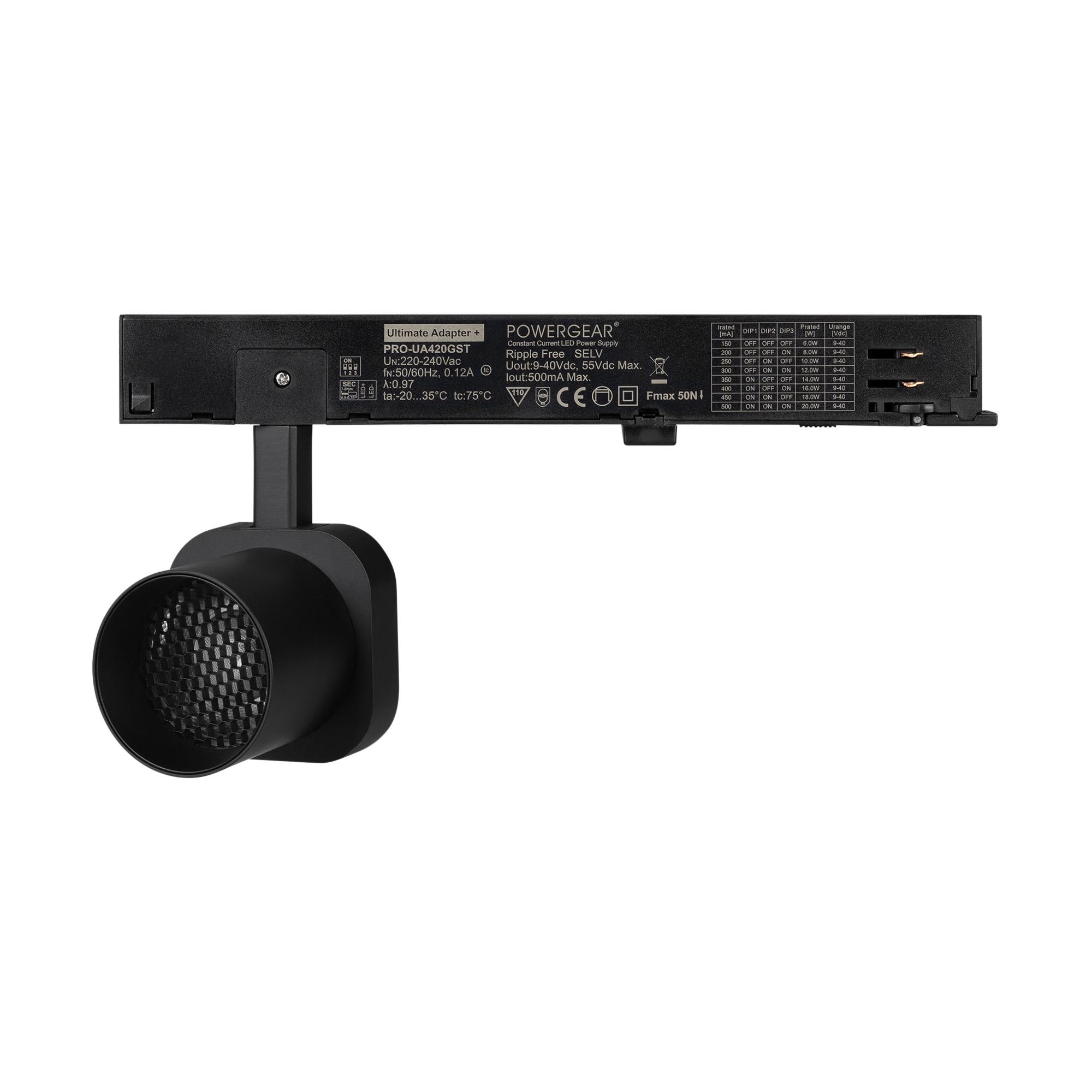 Светильник для треков/шин 4 провода. Мощность 10 Вт, св. поток 650 лм, 65 лм/Вт, дневной 4000 K, CRI>95, угол 20°, напряжение питания 230 В. Решетка HONEYCOMB в комплекте. Черный квадратный корпус из алюминия, материал линзы PC поликарбонат, степень защиты IP20. Размер световой части 60х60х62 мм. Монтаж на трек 3-фазный. Драйвер встроенный 9-40 В, 250мА., пульсация <1%