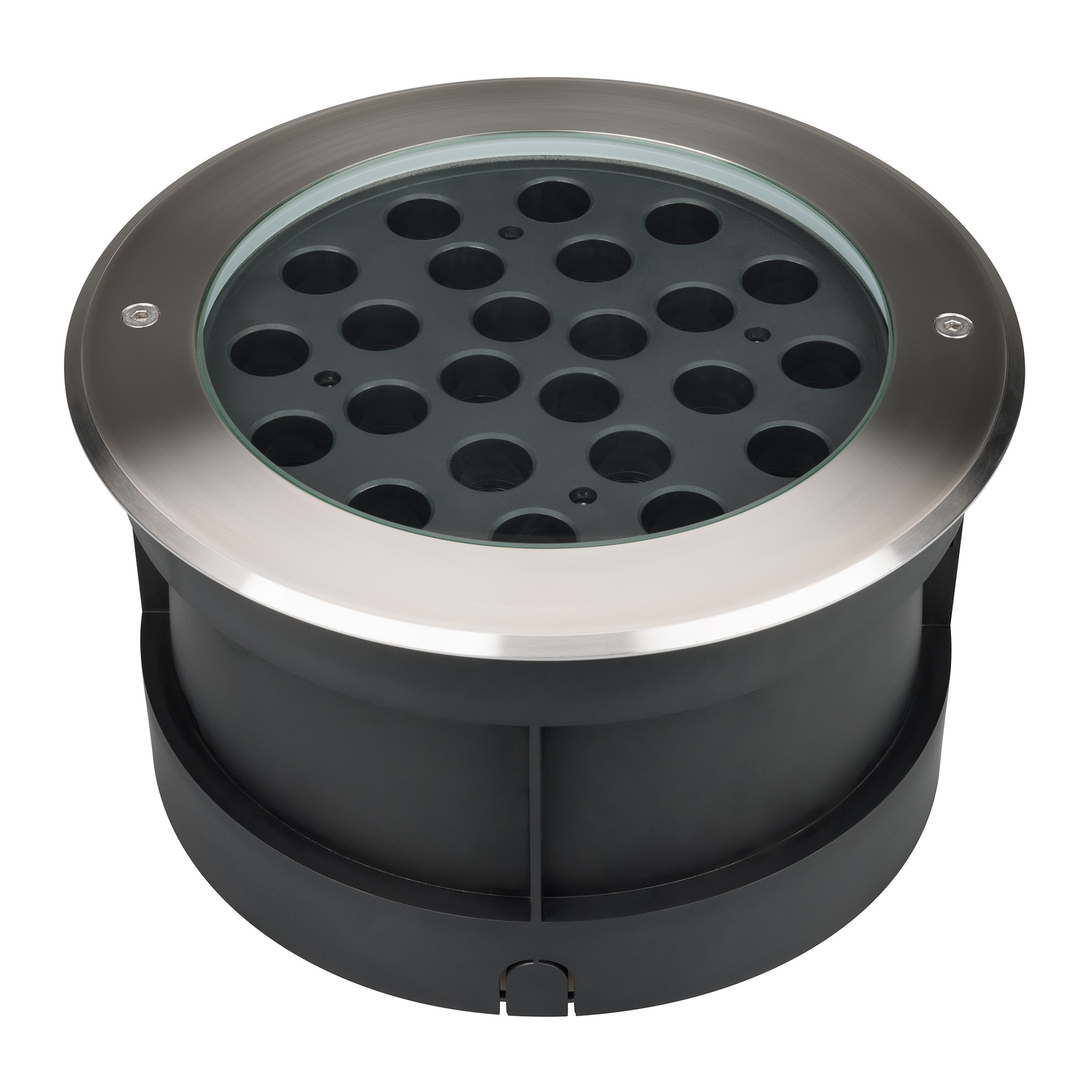 Встраиваемый светодиодный светильник для грунта и пола. Мощность 48Вт, световой поток 3250 лм, цвет дневной 4000К. CRI(Ra)>80, угол 20°. Круглый влагозащищенный корпус IP67, нержавеющая сталь. Экран закалённое стекло. Питание 230В, 48Вт. Размер DxH Ø260x150мм. Установка в отверстие DxH Ø239x144мм.