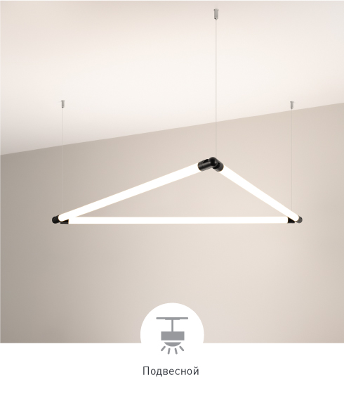 Стильный треугольный светильник на тонких подвесах реализует основное освещение и становится ярким, необычным акцентом в интерьере. Благодаря геометричной форме и современному дизайну SABER гармонично вписывается в пространства офисов, магазинов и частных интерьеров и добавляет характер и индивидуальность. Высокий индекс цветопередачи (CRI>90) точно передает естественные оттенки, а мягкое рассеянное свечение дневного цвета (4000 K) создает комфортную, бодрящую атмосферу для работы, шопинга или активных занятий дома.