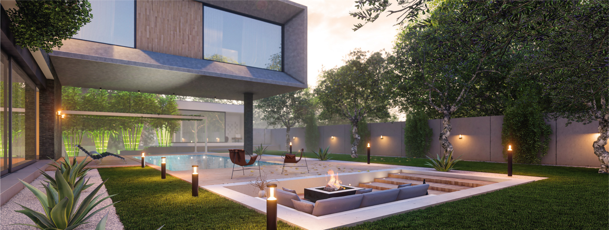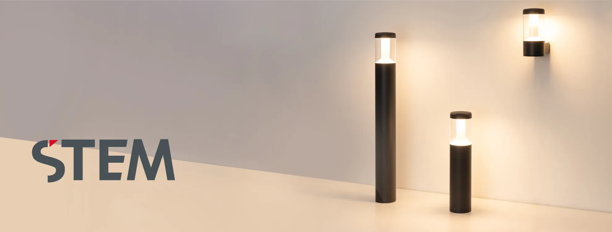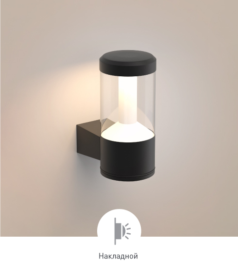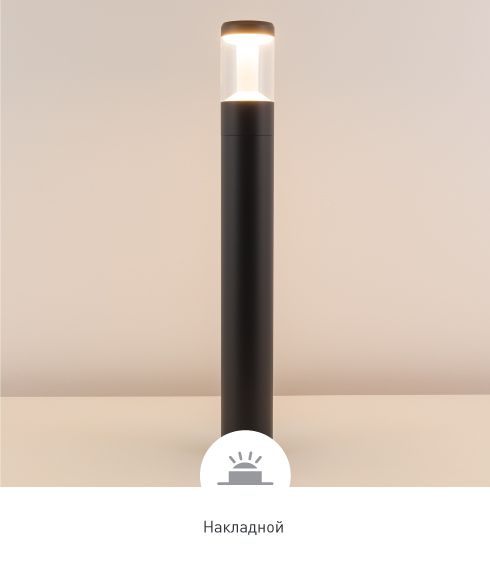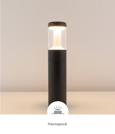 Цилиндрические светильники-столбики высотой 500 или 900 мм и настенные светильники с влагозащищенным корпусом темно-серого цвета. Светильники излучают мягкое, приятное для глаз свечение.