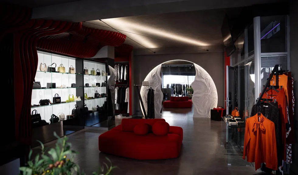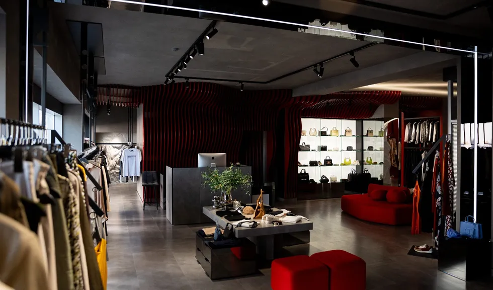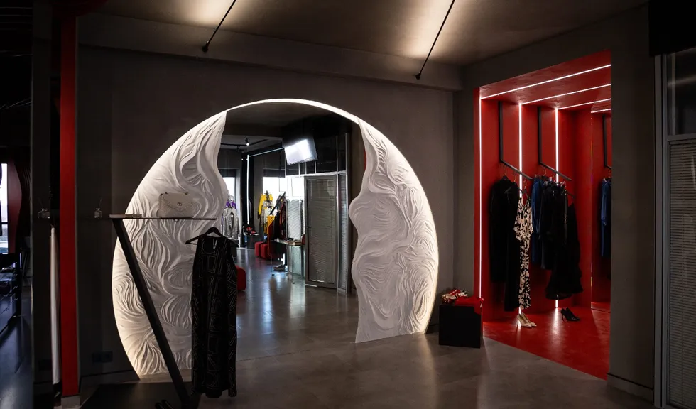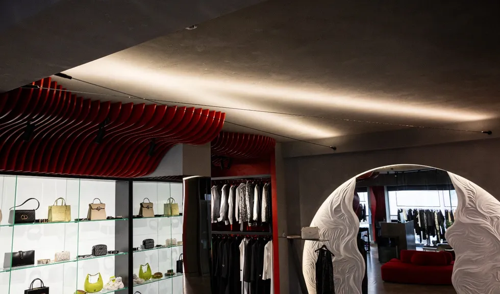 Контурная LED-подсветка добавляет пространству глубины: она обрамляет ниши, стеллажи и декоративные элементы, визуально разделяя зоны и придавая интерьеру современный лоск. Теплый свет в примерочных создает комфорт, а нейтрально-белое освещение в торговой зоне обеспечивает точную цветопередачу.