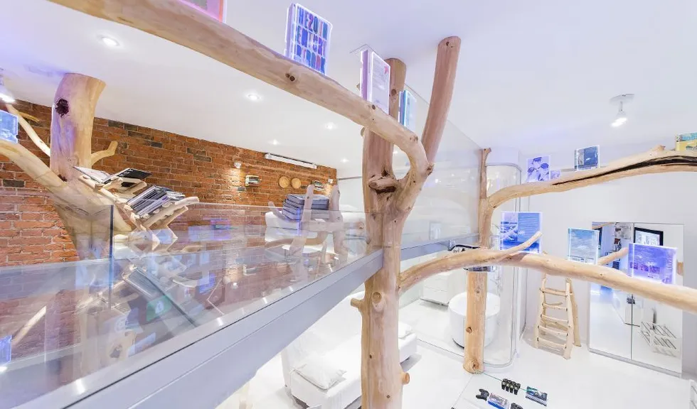 Интерьер данной квартиры-студии привлекает необычным сочетанием современных материалов - стекла и металла, строгих геометрических форм, что характерно для стиля хай-тек, и натурального материала - дерева. Из дерева здесь сделаны не только элементы мебели - обеденная стойка, стулья и кресла, стволы и ветви деревьев буквально окутывают студию. Интереснейший приём - стальные опоры второго уровня студии заключены в стволы деревьев, благодаря чему может возникнуть ощущение своеобразного "домика на дереве".