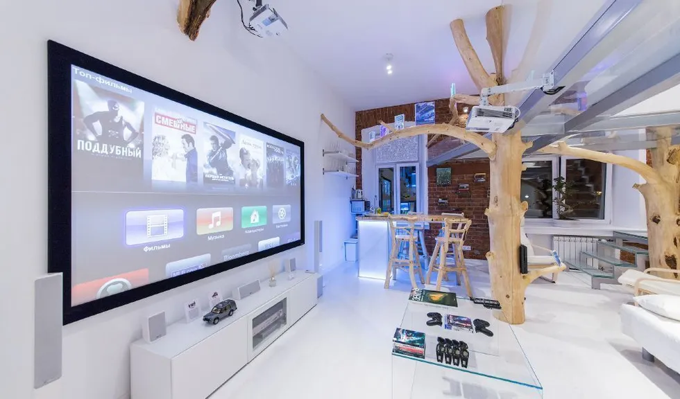 Второй уровень квартиры-студии был выделен для спальной зоны, её отделили от основного пространства необычным стеклом, способным изменять степень прозрачности. Оно было оснащено дополнительной светодиодной подсветкой на основе многоцветной светодиодной ленты arlight®. Мультицветная RGB светодиодная лента arlight® также используется в подсветке основания стола-стойки обеденный зоны студии.