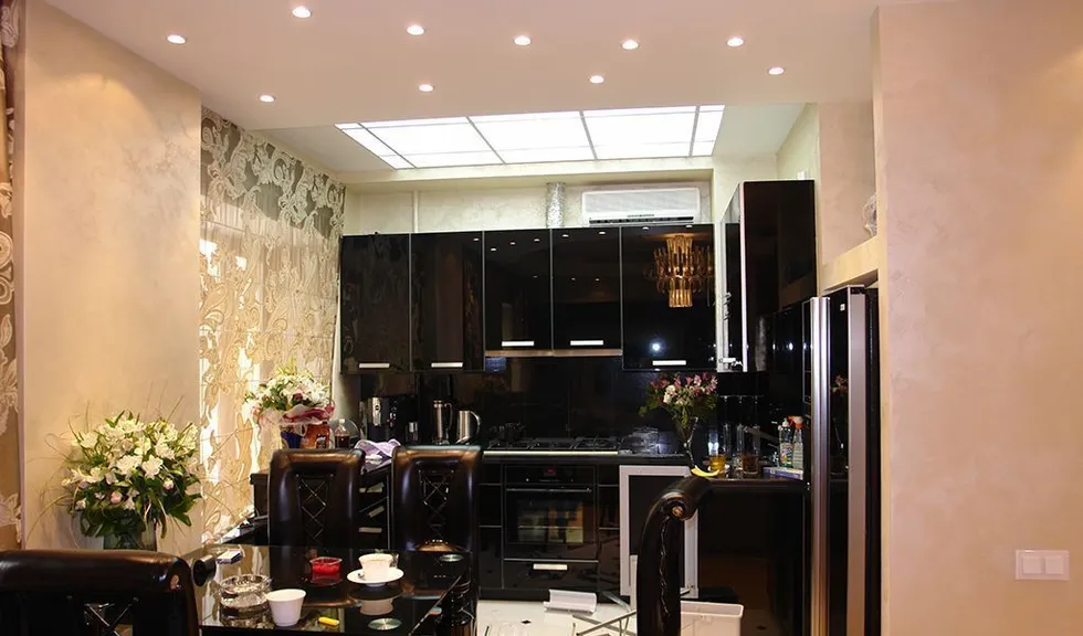 Освещение рабочей зоны кухни было выполнено способом витражной подсветки. Над светопропускающим пластиком (оргстеклом) была с равными промежутками наклеена светодиодная лента. Таким образом создаётся необычный эффект светящейся поверхности потолка. Над обеденной зоной заняли своё место точечные светильники.