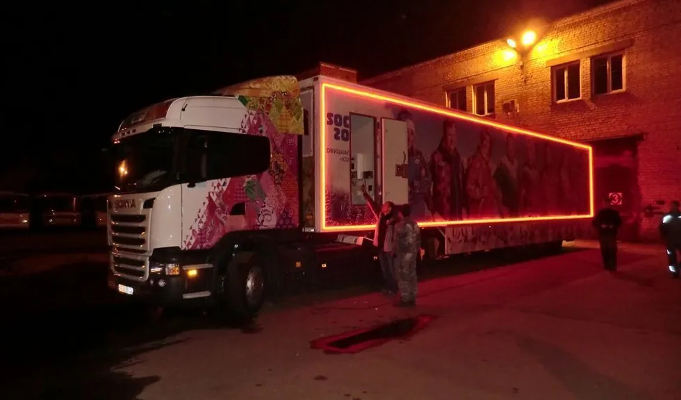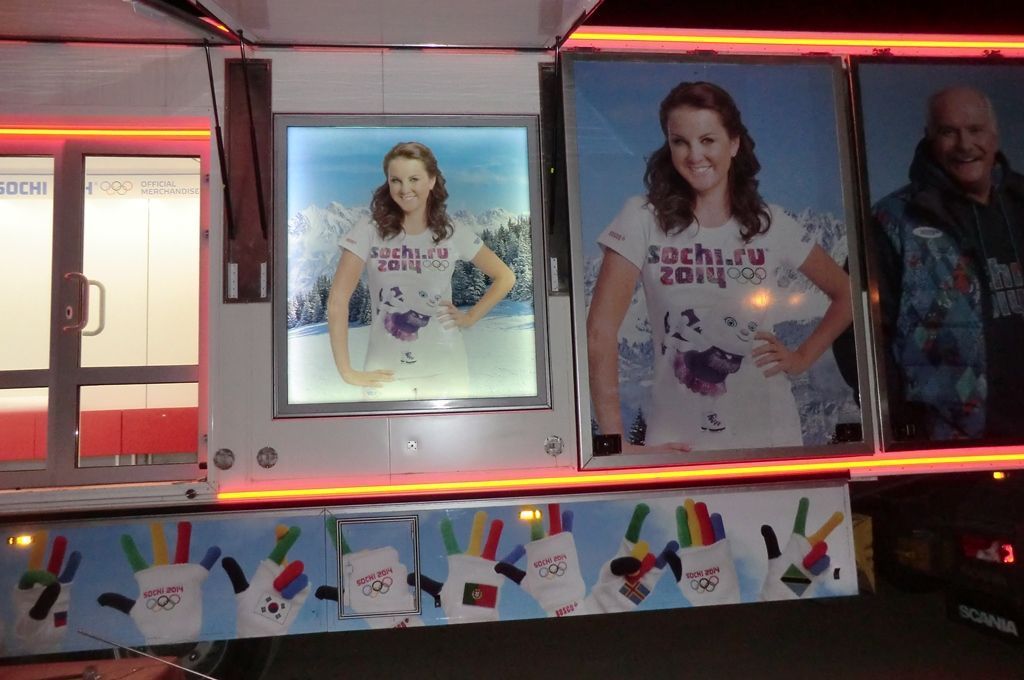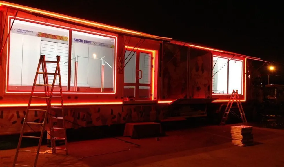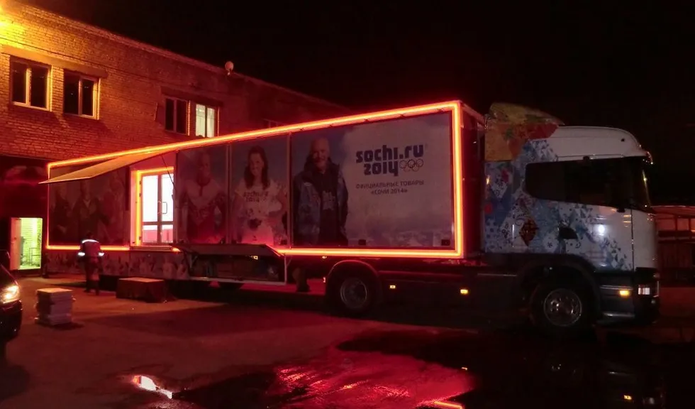 Светодиодная подсветка была установлена на тягач и прицеп, в котором оборудован магазин товаров с символикой Олимпийских игр Сочи 2014. Снаружи прицеп был выделен контурной подсветкой, выполненной при помощи светодиодной ленты arlight®. Светодиодная лента установлена в алюминиевый профиль arlight® с матовым экраном, создающим эффект сплошной световой линии.