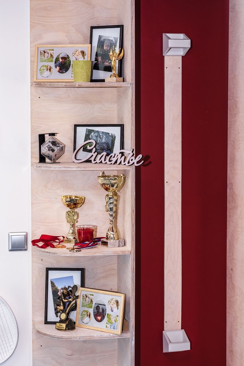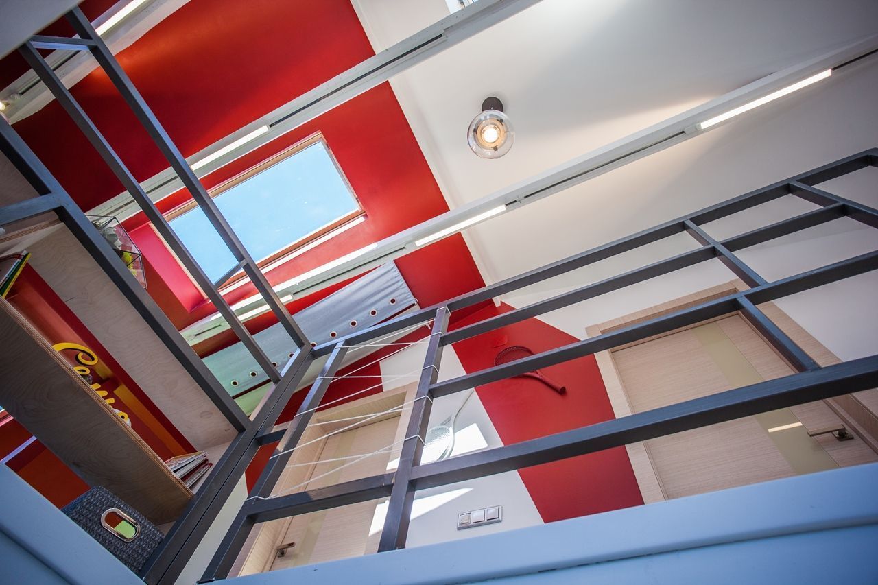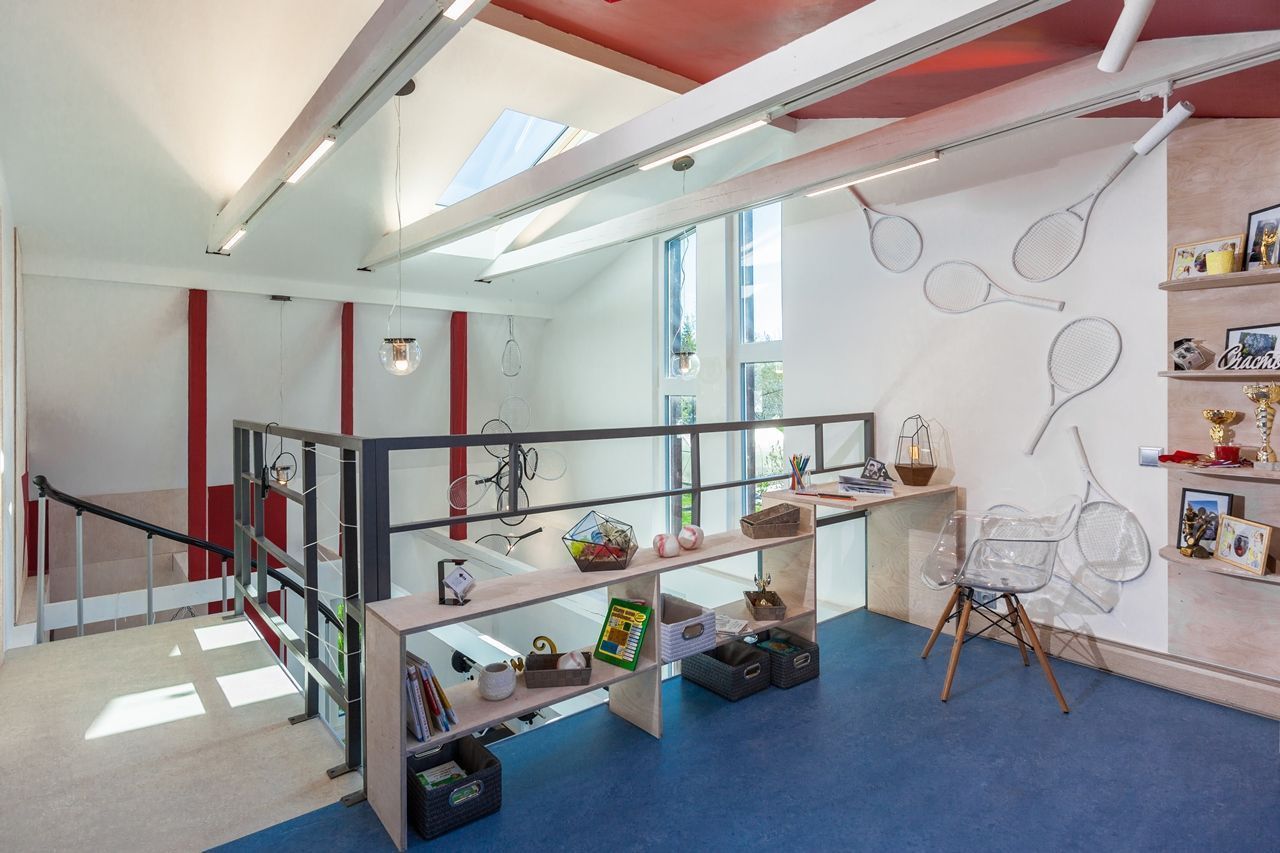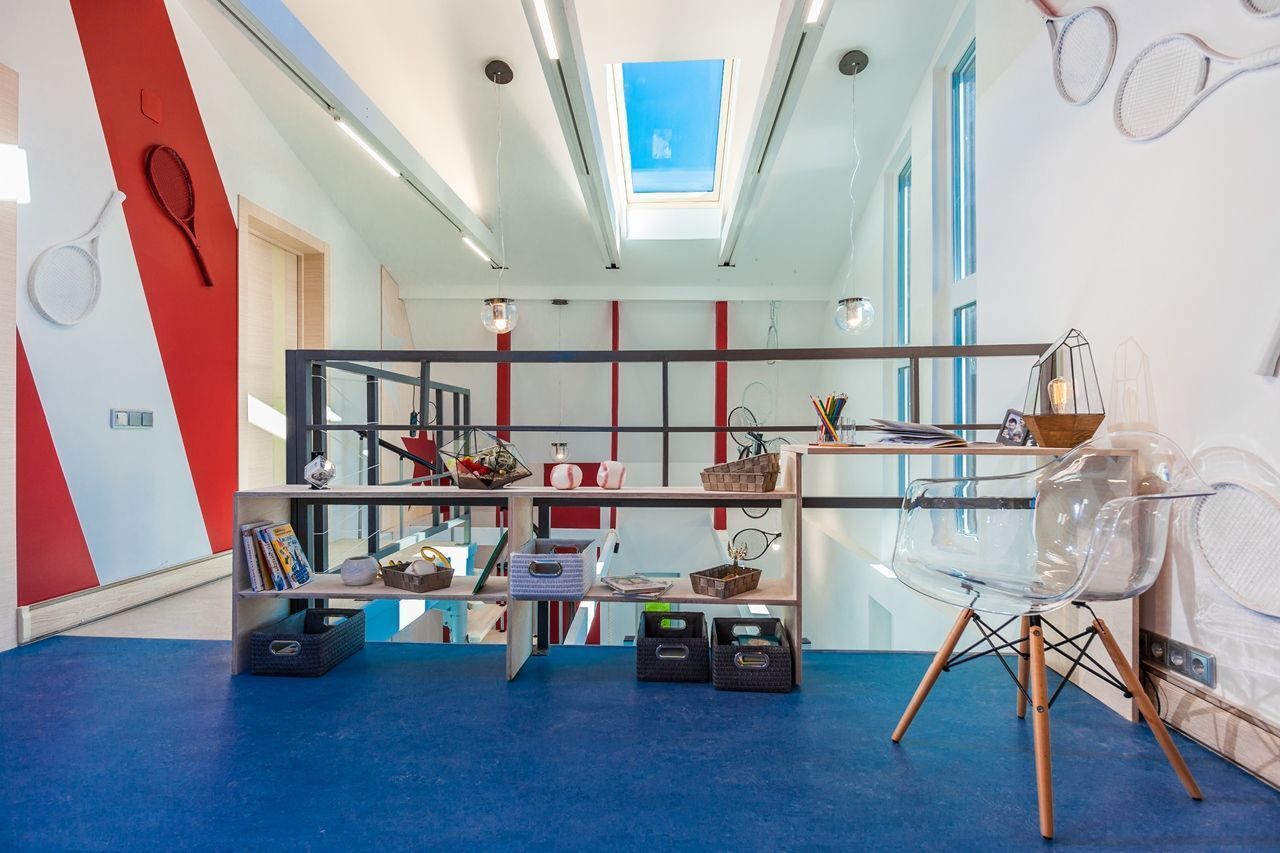 Объектом переделки стали две комнаты в загородном доме, расположенные на двух этажах. Часть перекрытий была убрана, в крыше появилось множество больших окон. Объединённое помещение стало просторным, воздушным и светлым. Светлым и днём, и в тёмное время суток благодаря светодиодным светильникам разных типов.