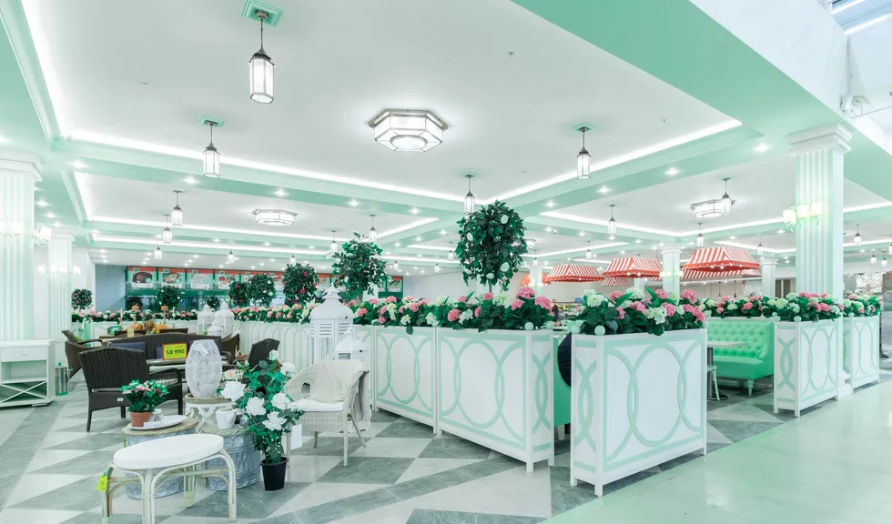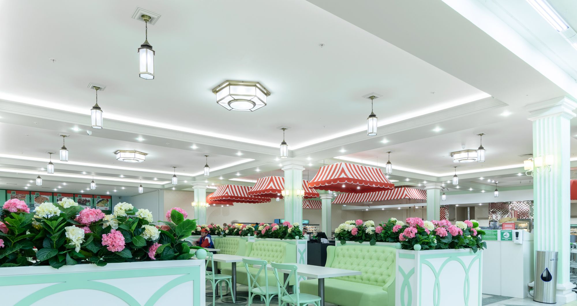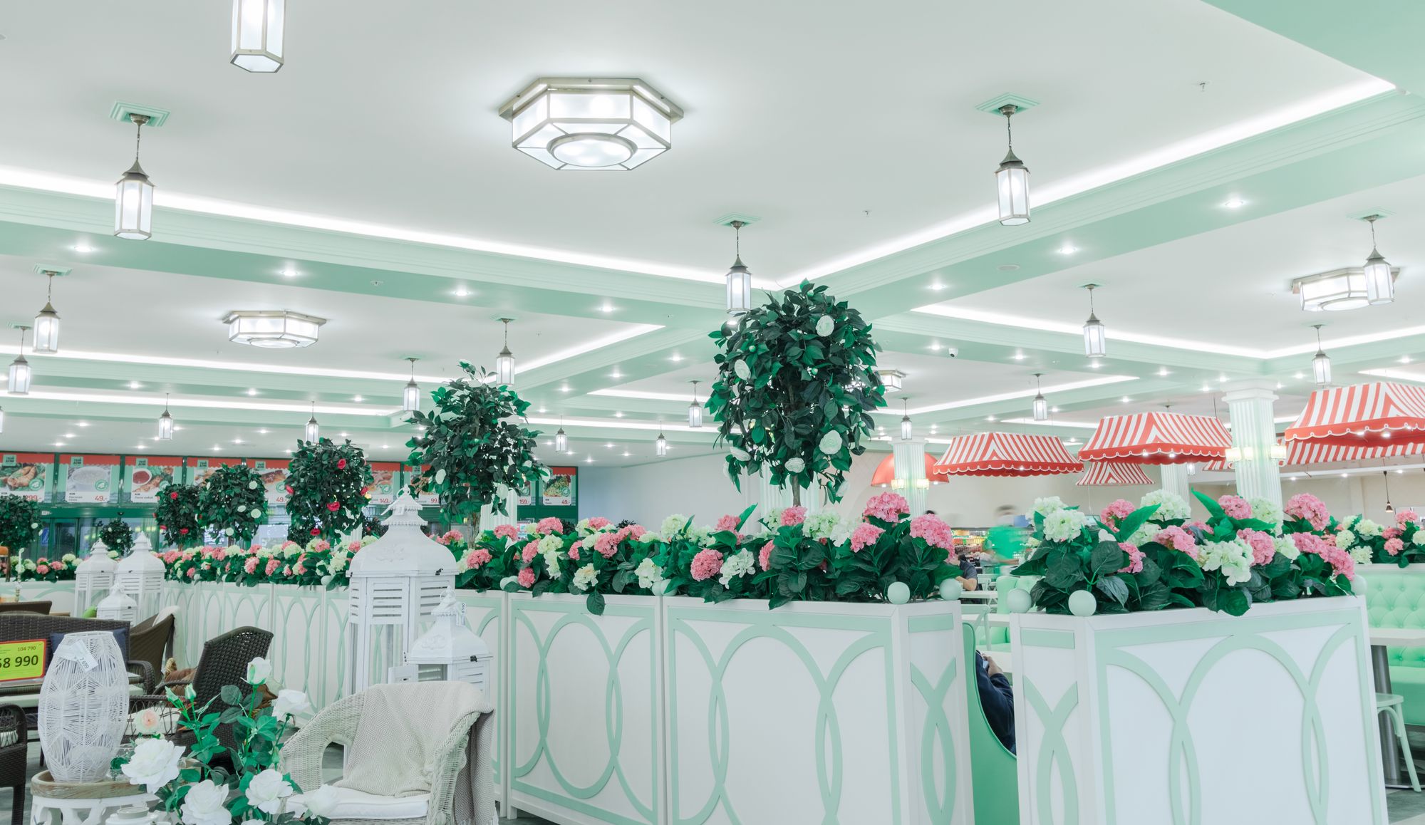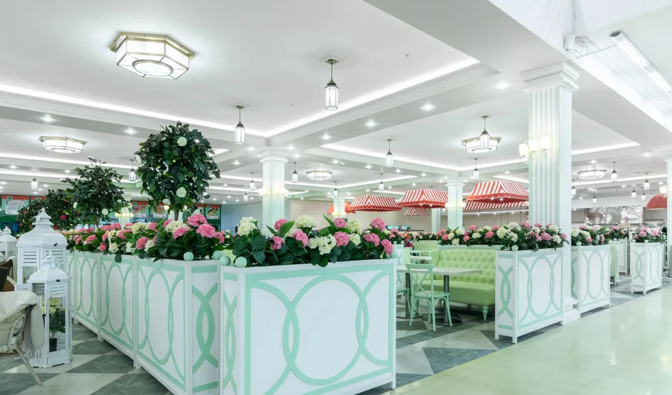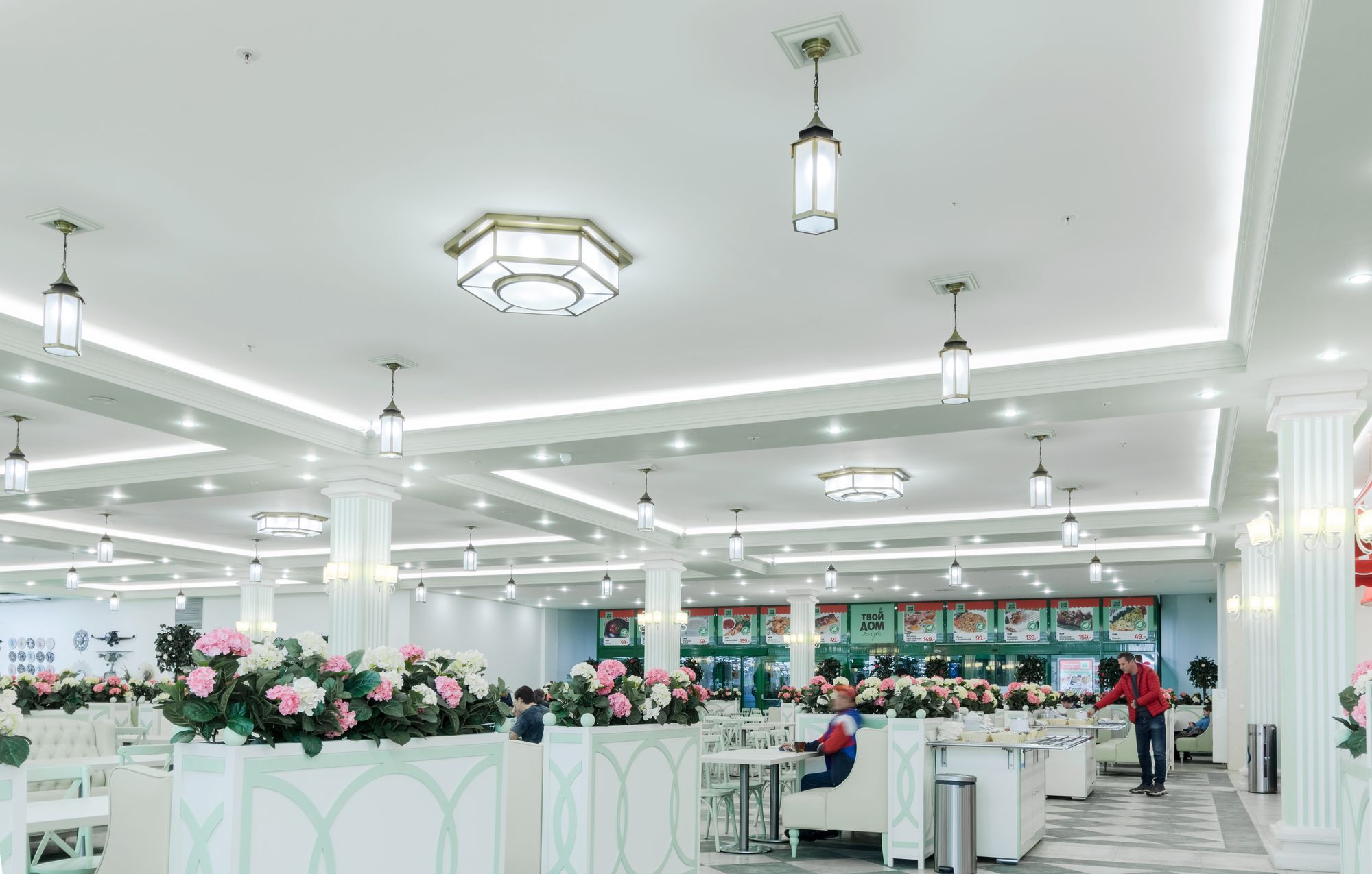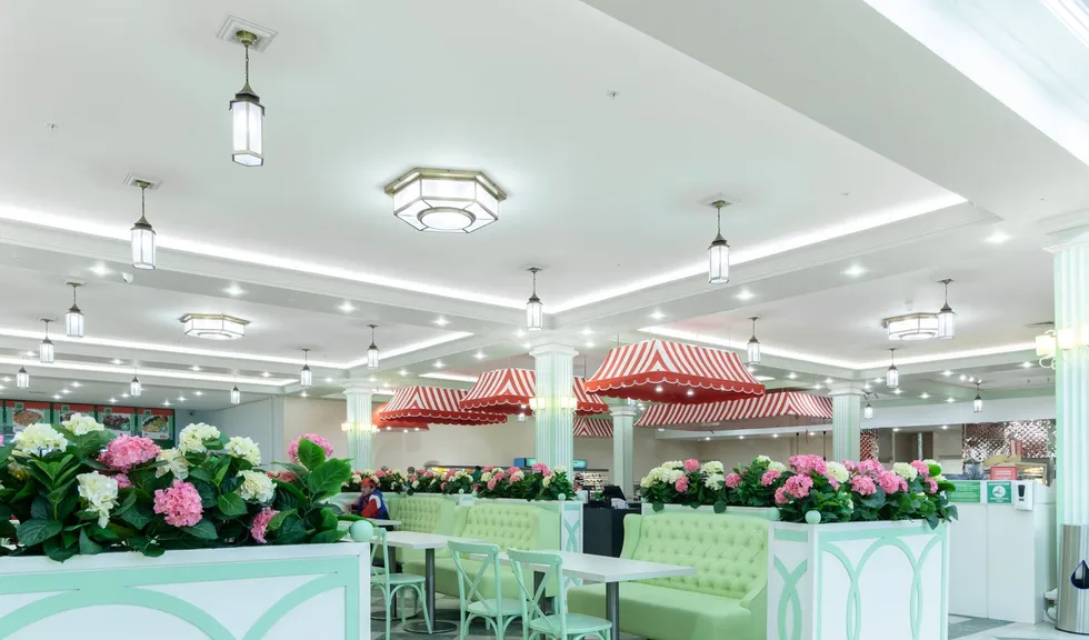 Светодиодную контурную подсветку использовали по всему периметру потолка торговой площади. Такой световой прием является универсальным решением и позволяет организовать качественное основное освещение большой площади. Дневной свет с высоким индексом цветопередачи выгодно подчеркивает все достоинства предметов интерьера, сохраняет высокую работоспособность сотрудников в течение всего дня и побуждает посетителей к покупкам.