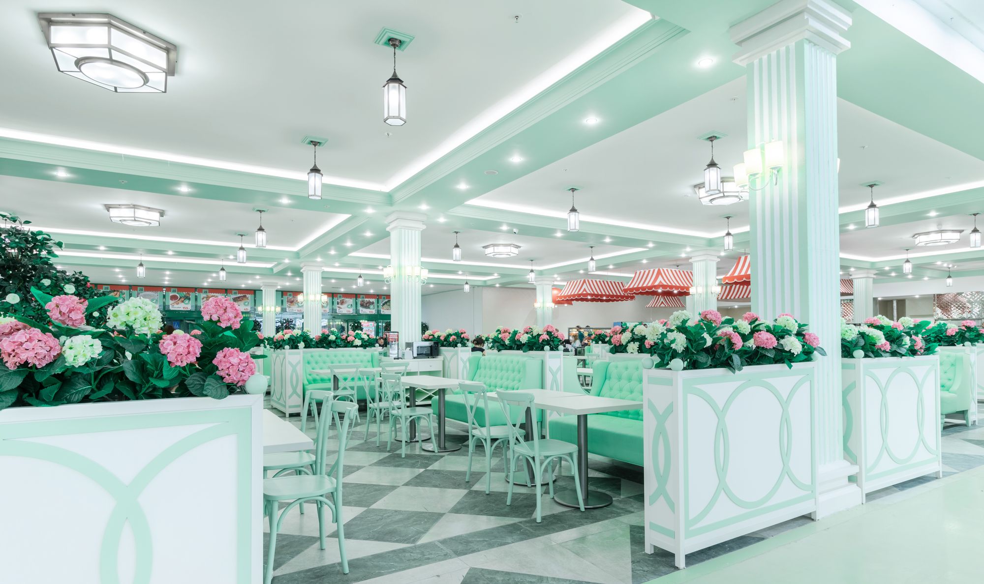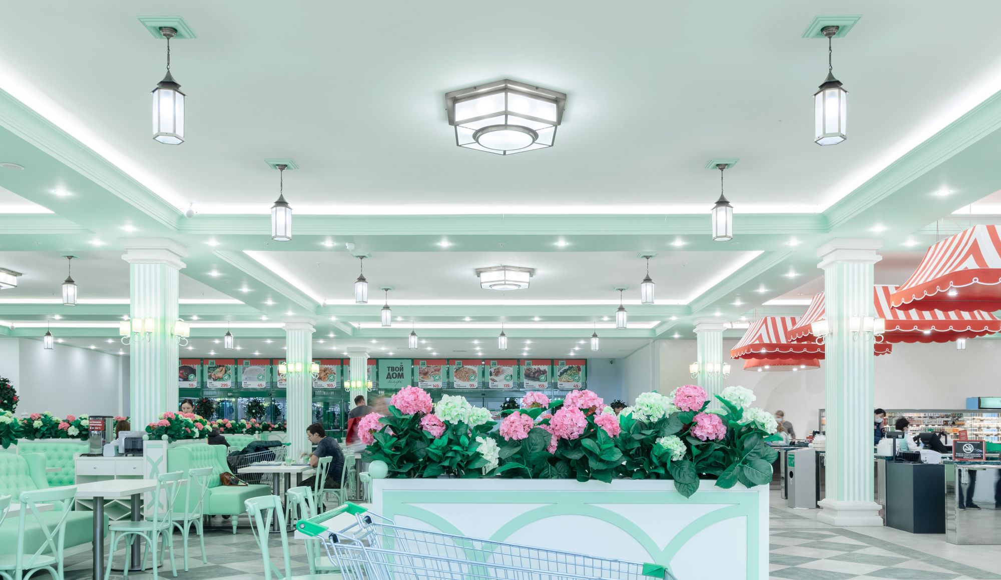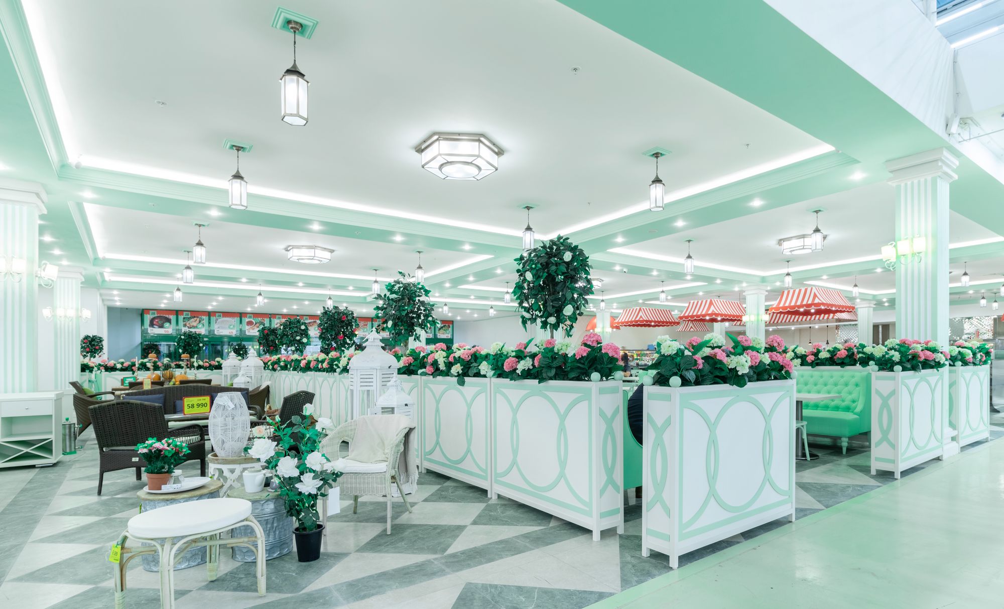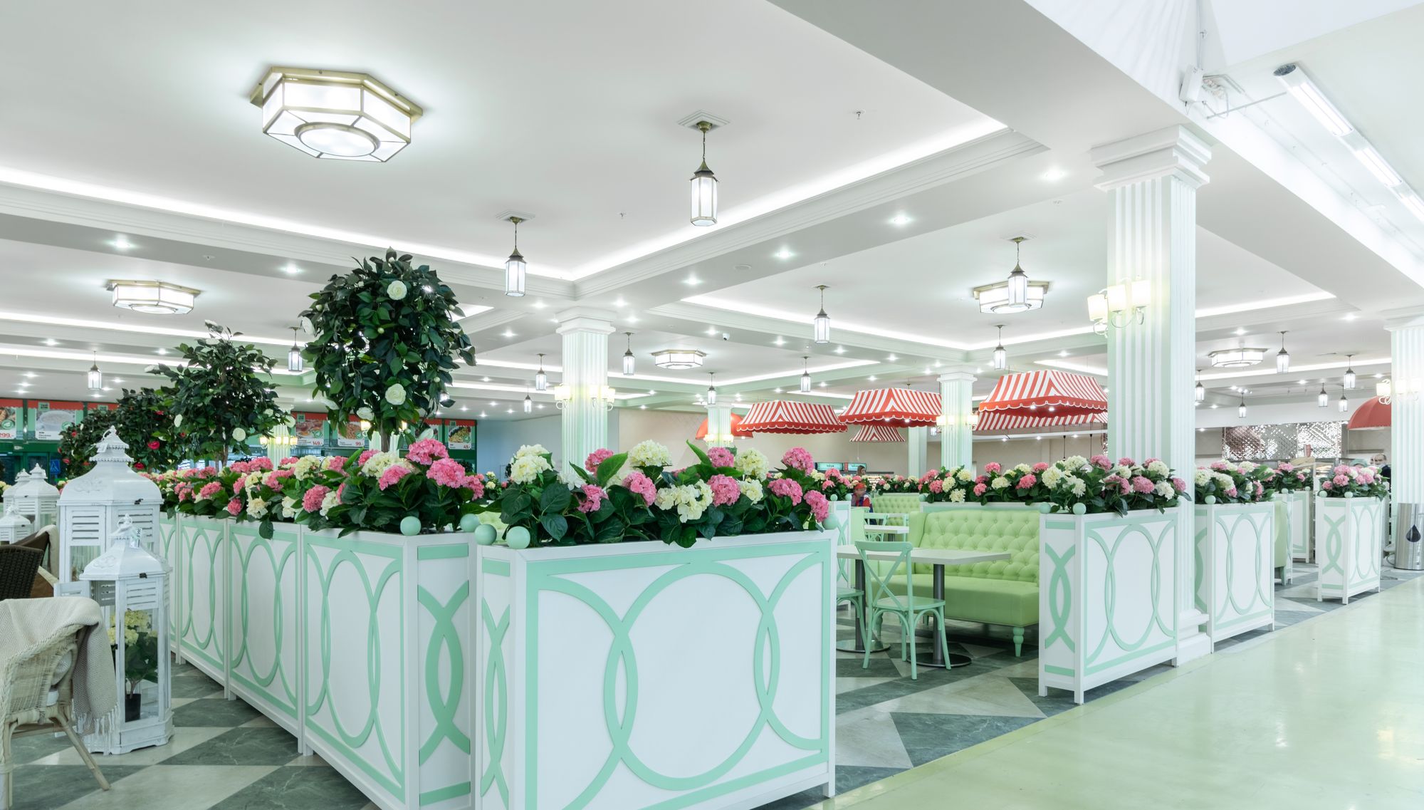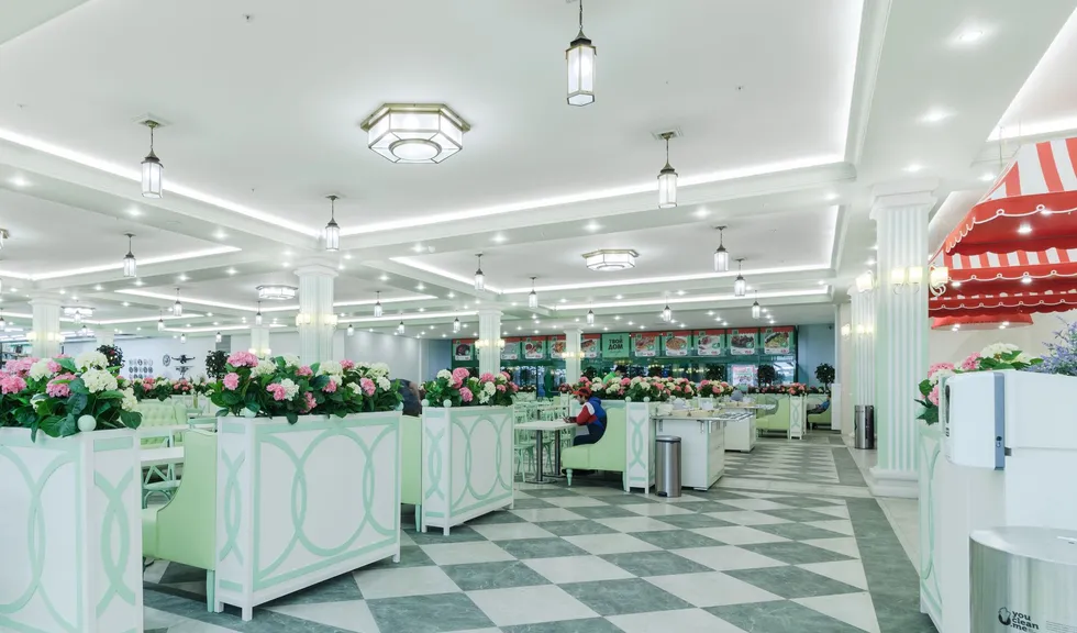 Светодиодную контурную подсветку использовали по всему периметру потолка торговой площади. Такой световой прием является универсальным решением и позволяет организовать качественное основное освещение большой площади. Дневной свет с высоким индексом цветопередачи выгодно подчеркивает все достоинства предметов интерьера, сохраняет высокую работоспособность сотрудников в течение всего дня и побуждает посетителей к покупкам.